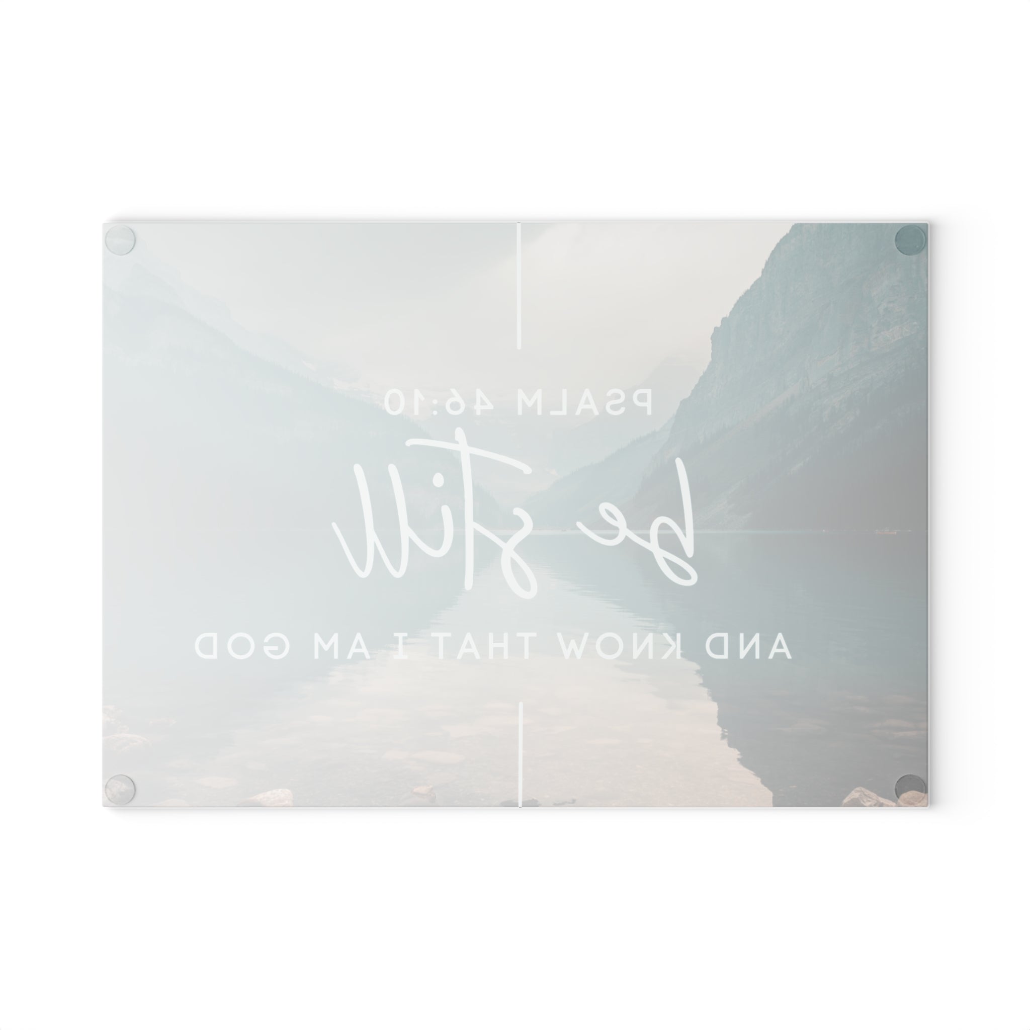 A calm, faith-centered glass cutting board that brings quiet moments into a busy kitchen. A soft mountain lake scene is printed with vibrant, fade-resistant inks and overlaid with the peaceful phrase “be still – Psalm 46:10.” The tempered, textured surface stands up to food prep while staying hygienic and easy to clean by hand. Rubber feet hold the board steady on countertops so you can chop or use it as a decorative serving surface without slipping. Choose from two sizes to fit a cozy prep area or a larger workstation. This piece works as a gentle reminder to pause, breathe, and center your day around a quiet, grounding truth. Product features - Tempered glass with textured, sanitary prep surface - Durable, scratch-resistant printed artwork in vibrant colors - Four rubber feet for stable, non-slip placement - Available in two sizes: 8"×11" or 11"×15" - Hand wash recommended to protect print and finish Care instructions - Use regular dish soap for cleaning and wipe down with a damp cloth.