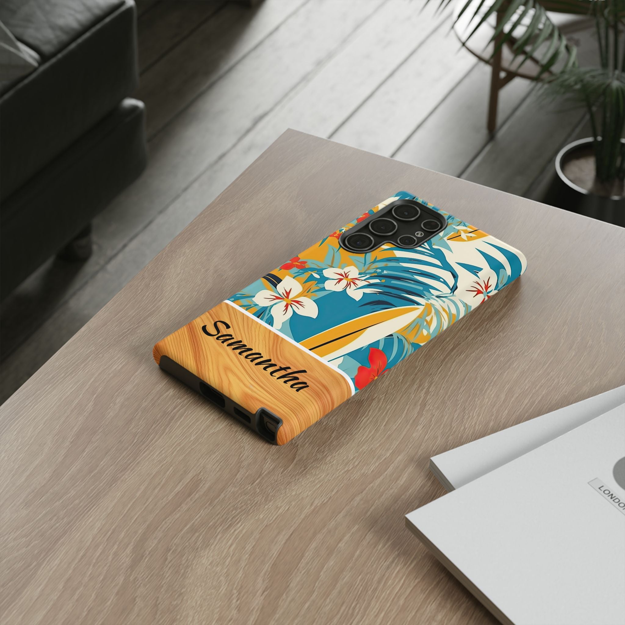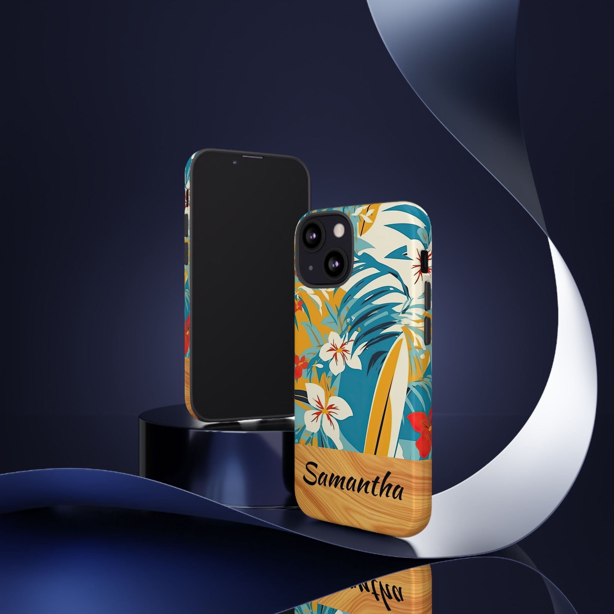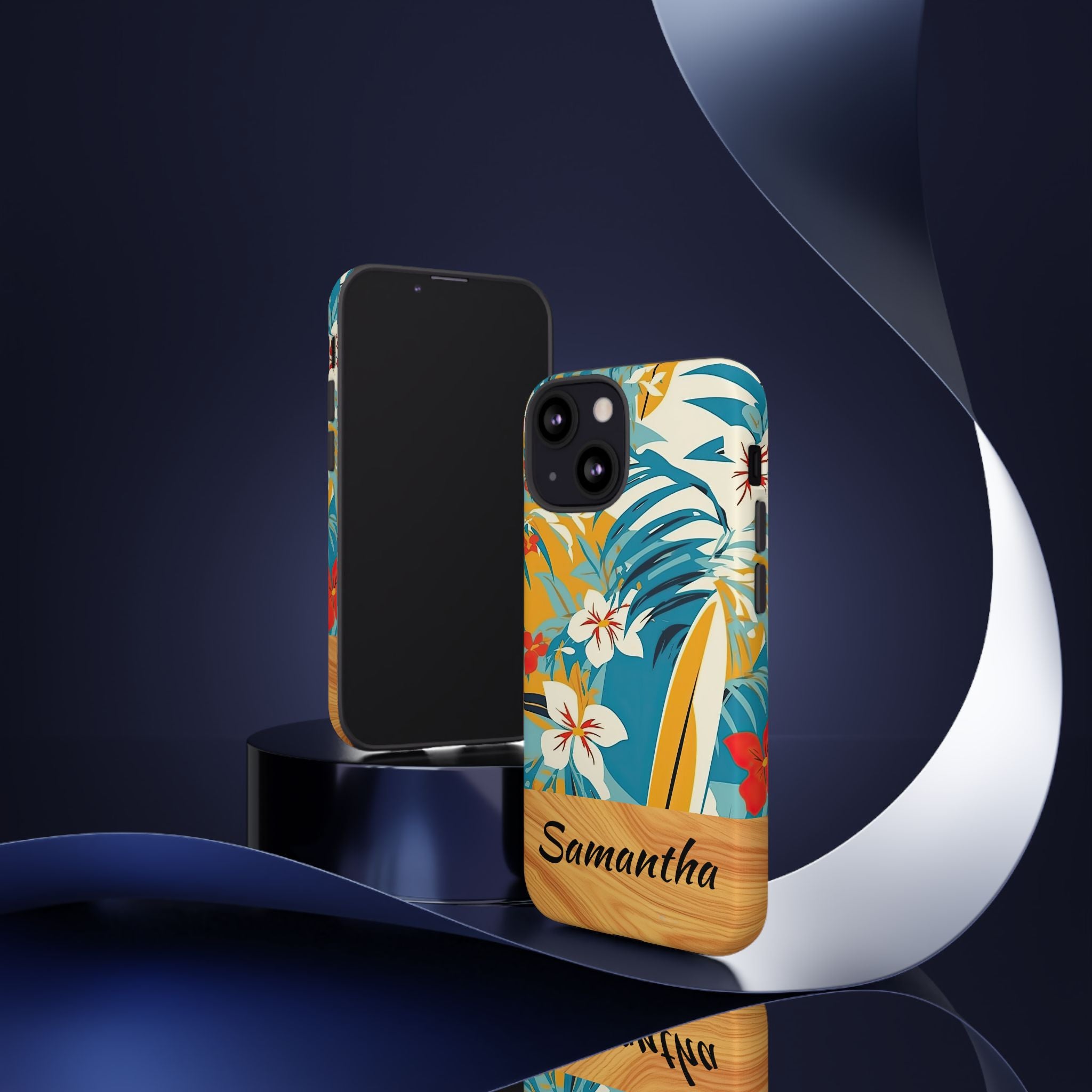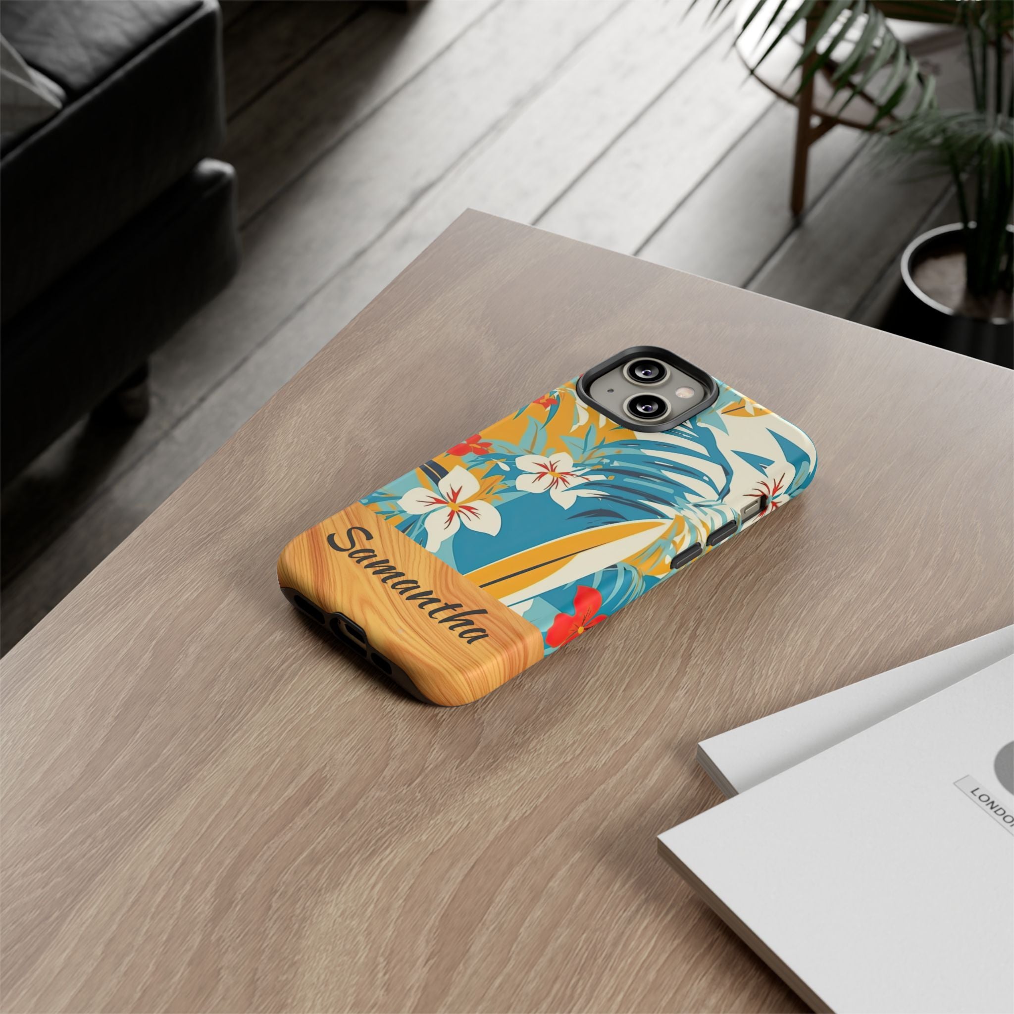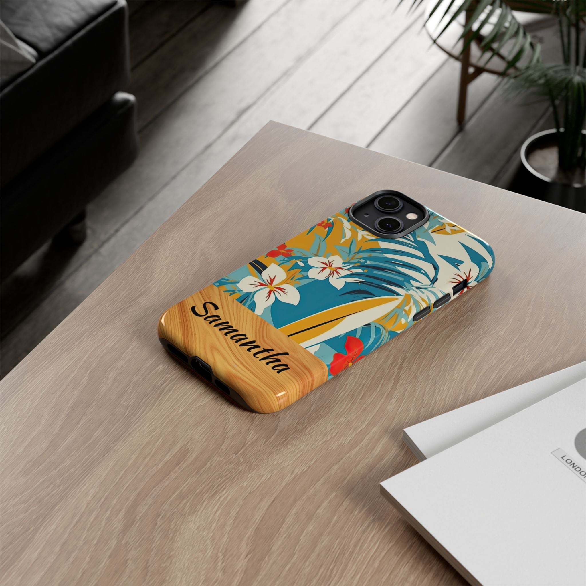 Custom Phone Tough Case Hawaii Surf Boards with Woodgrain Personalize with Name