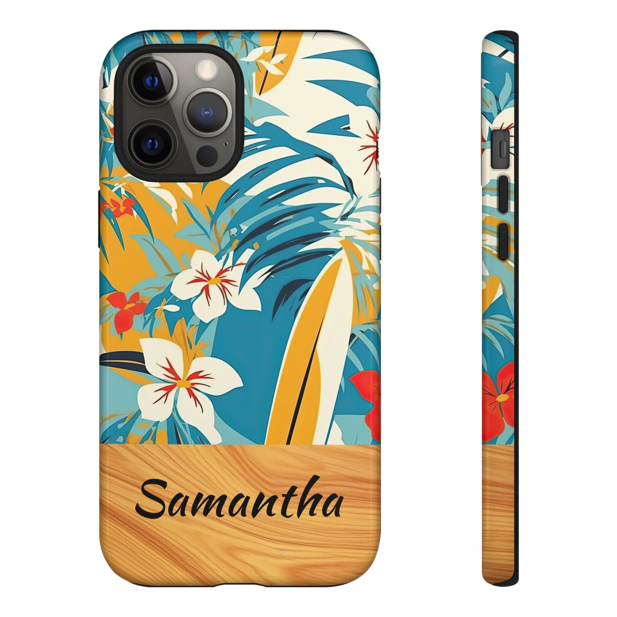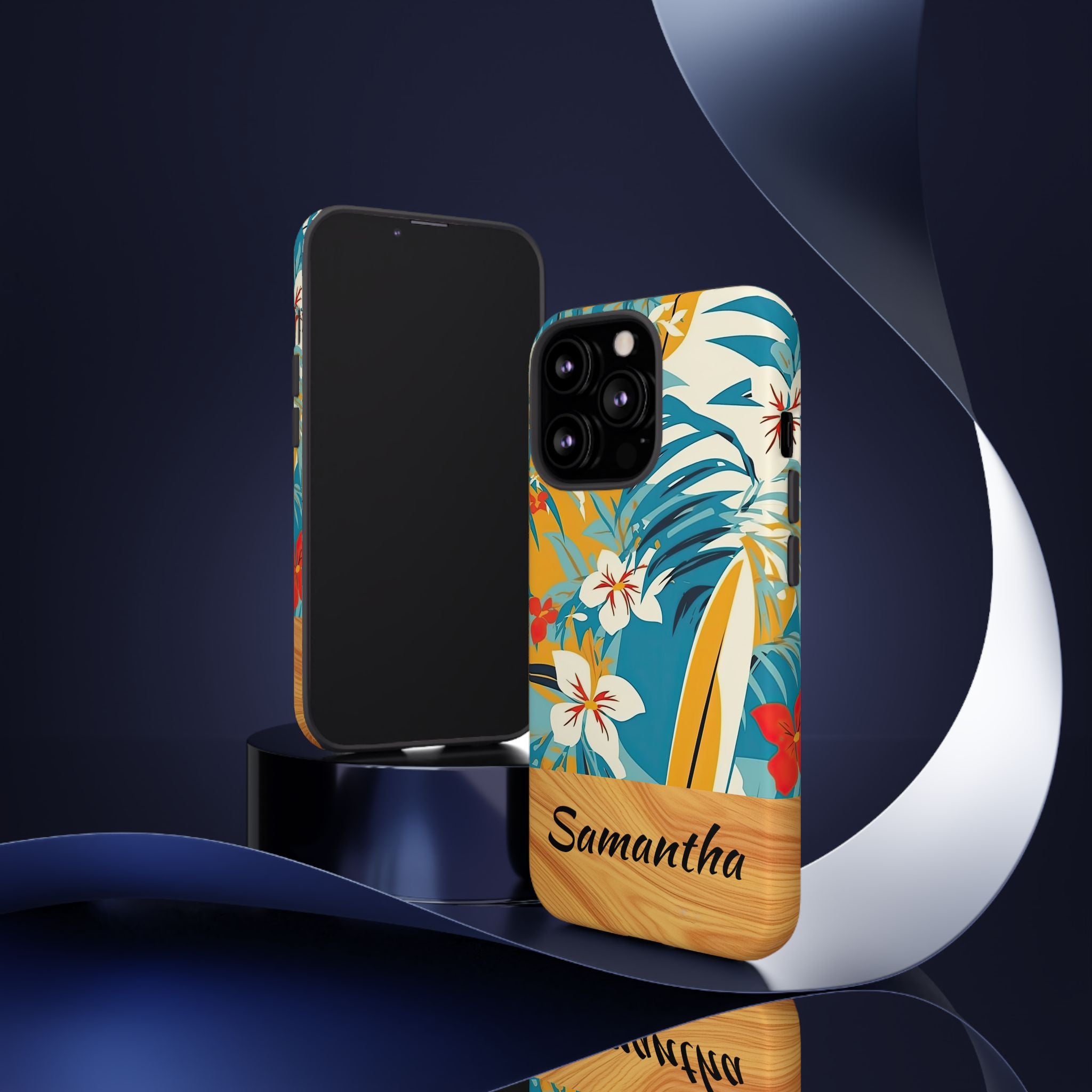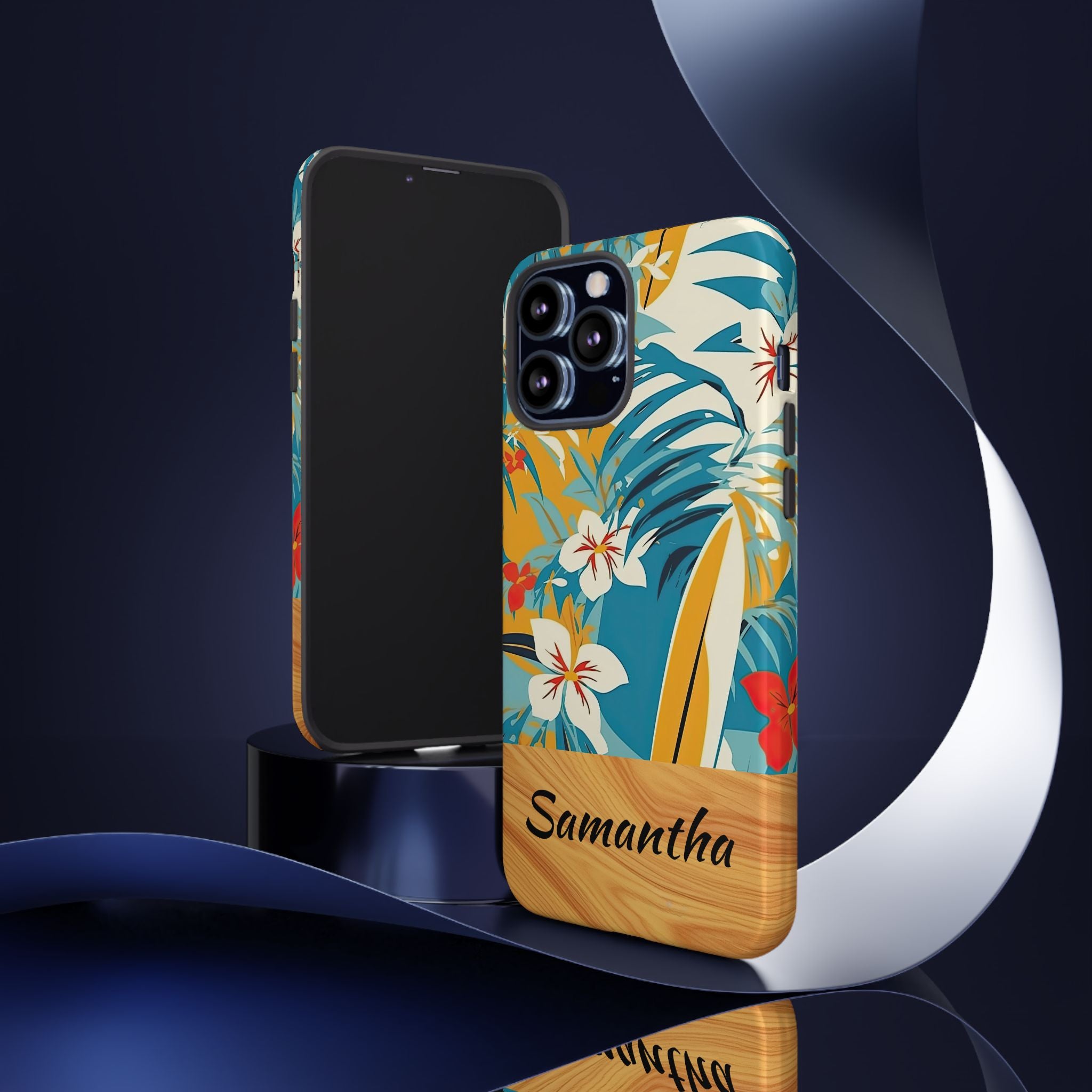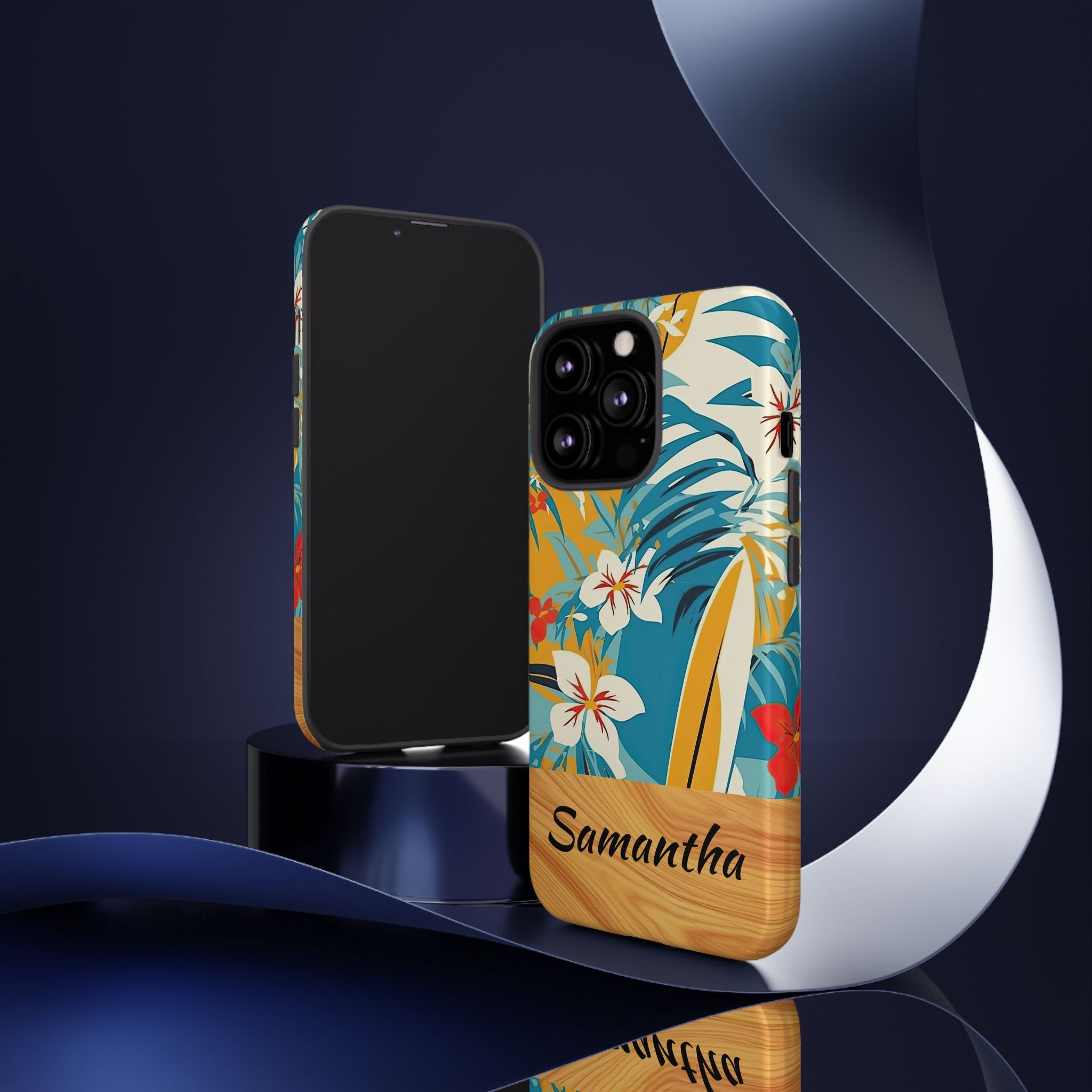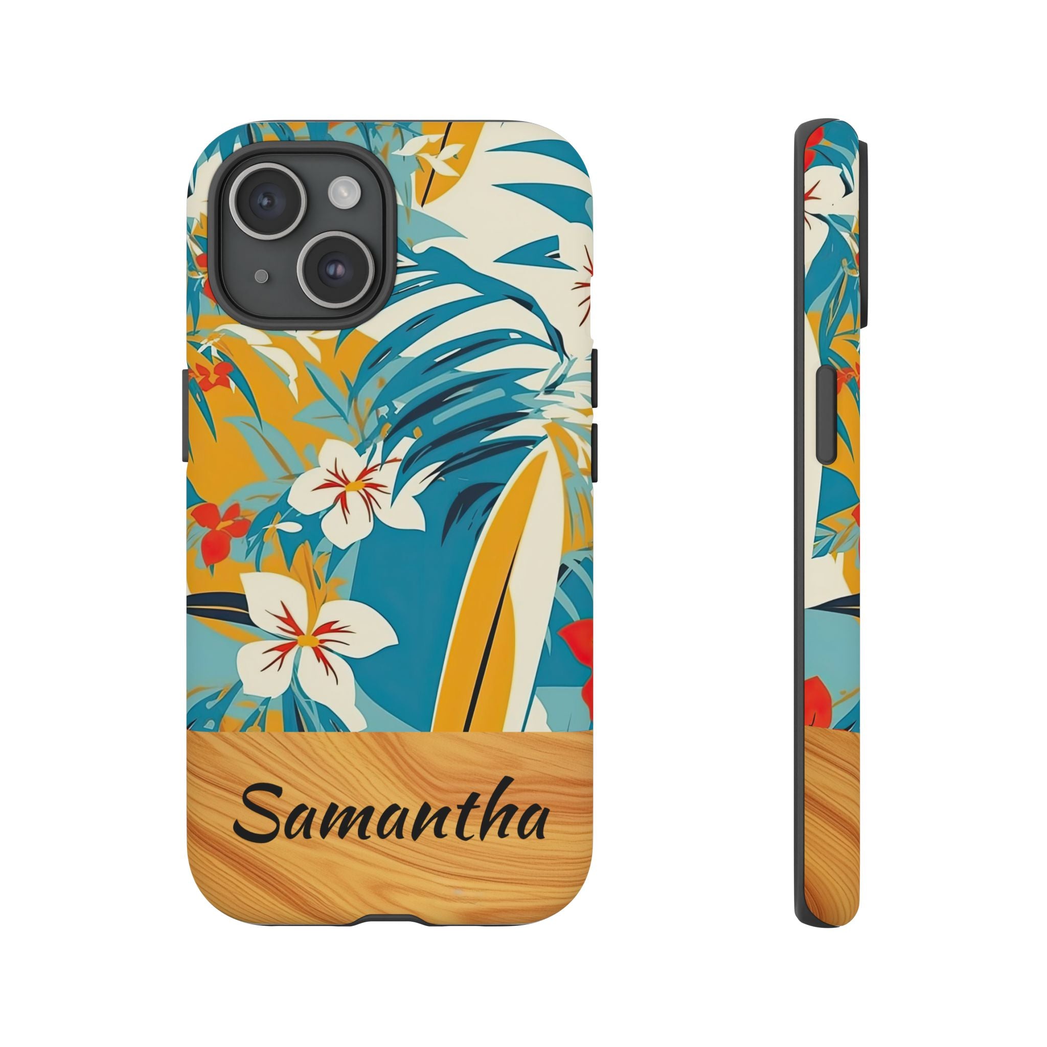 Custom Phone Tough Case Hawaii Surf Boards with Woodgrain Personalize with Name