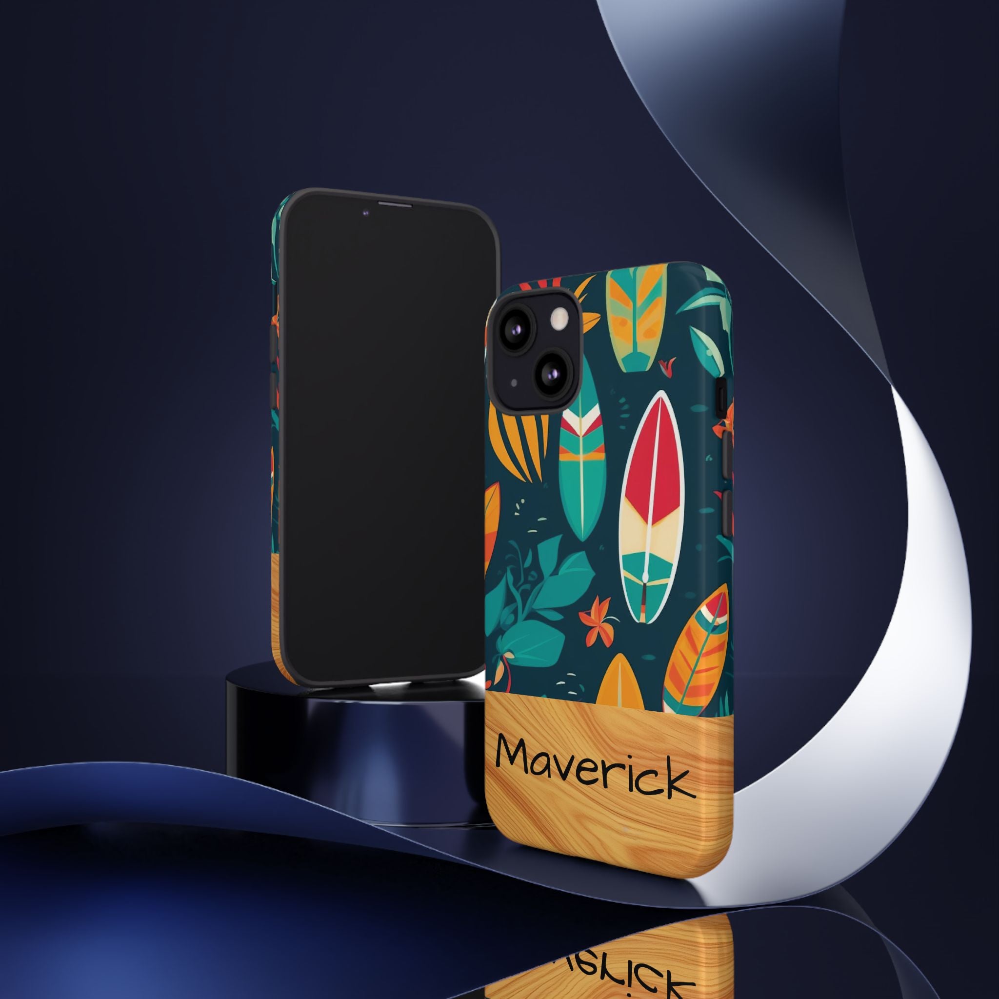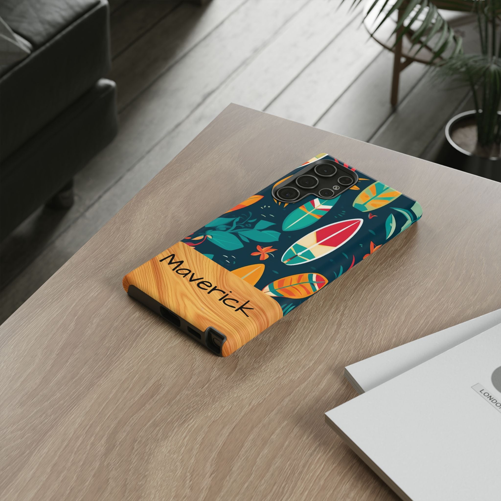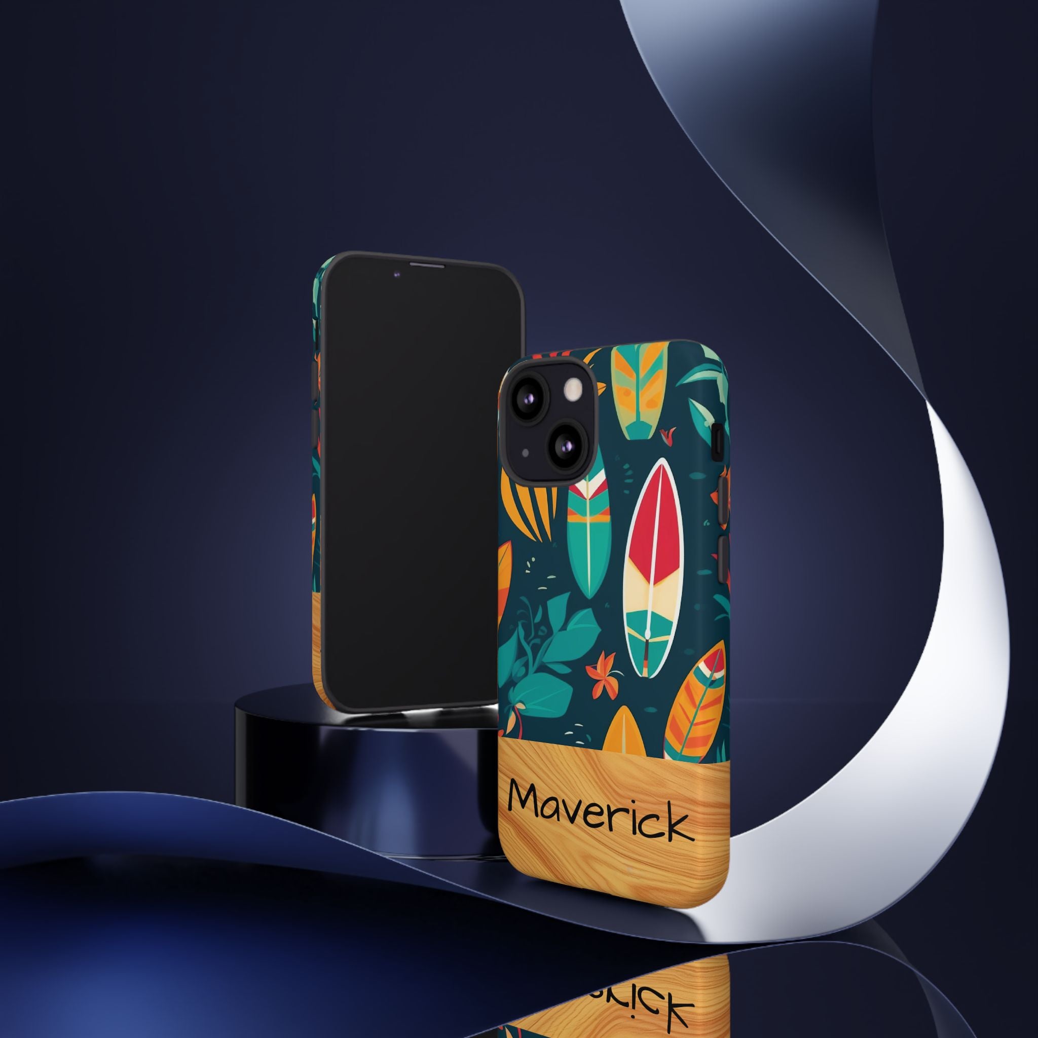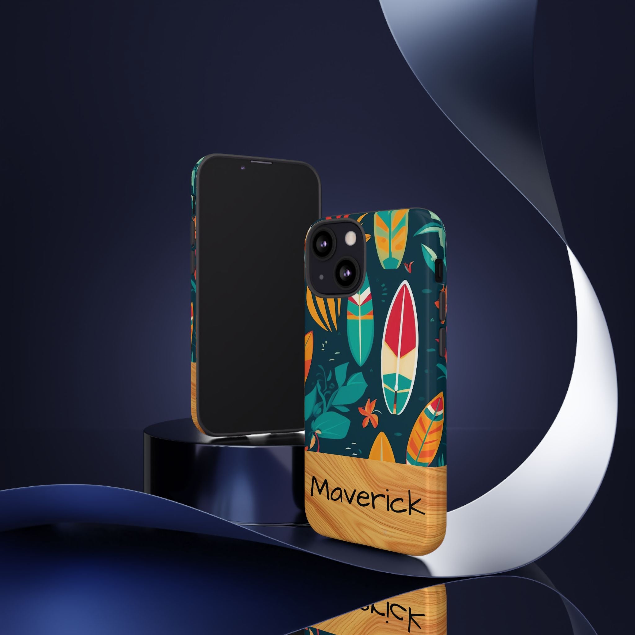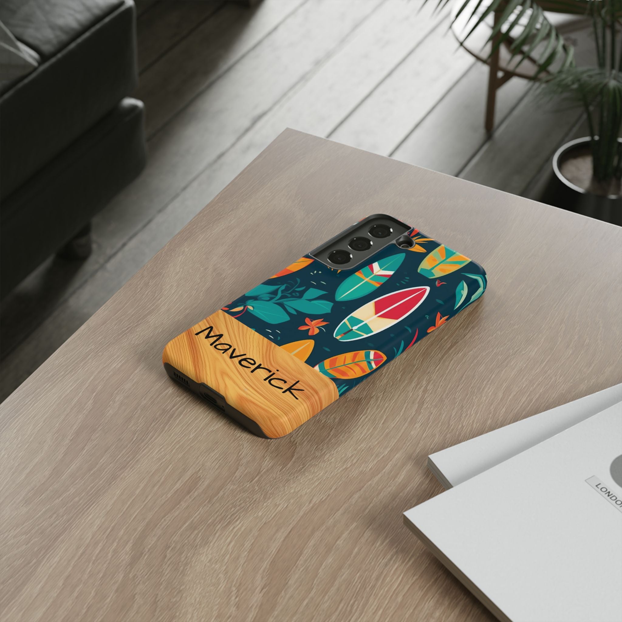 Custom Phone Tough Case Hawaii Surf Boards with Woodgrain Personalize with Name