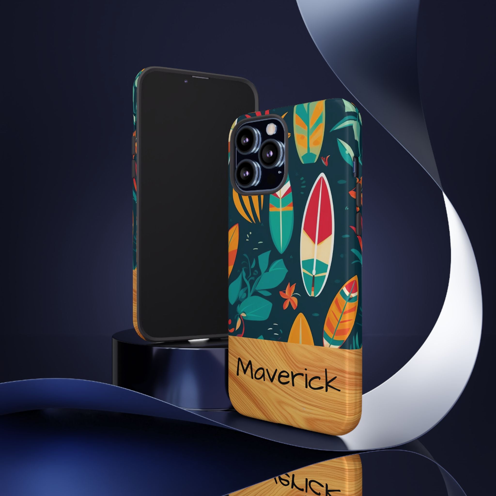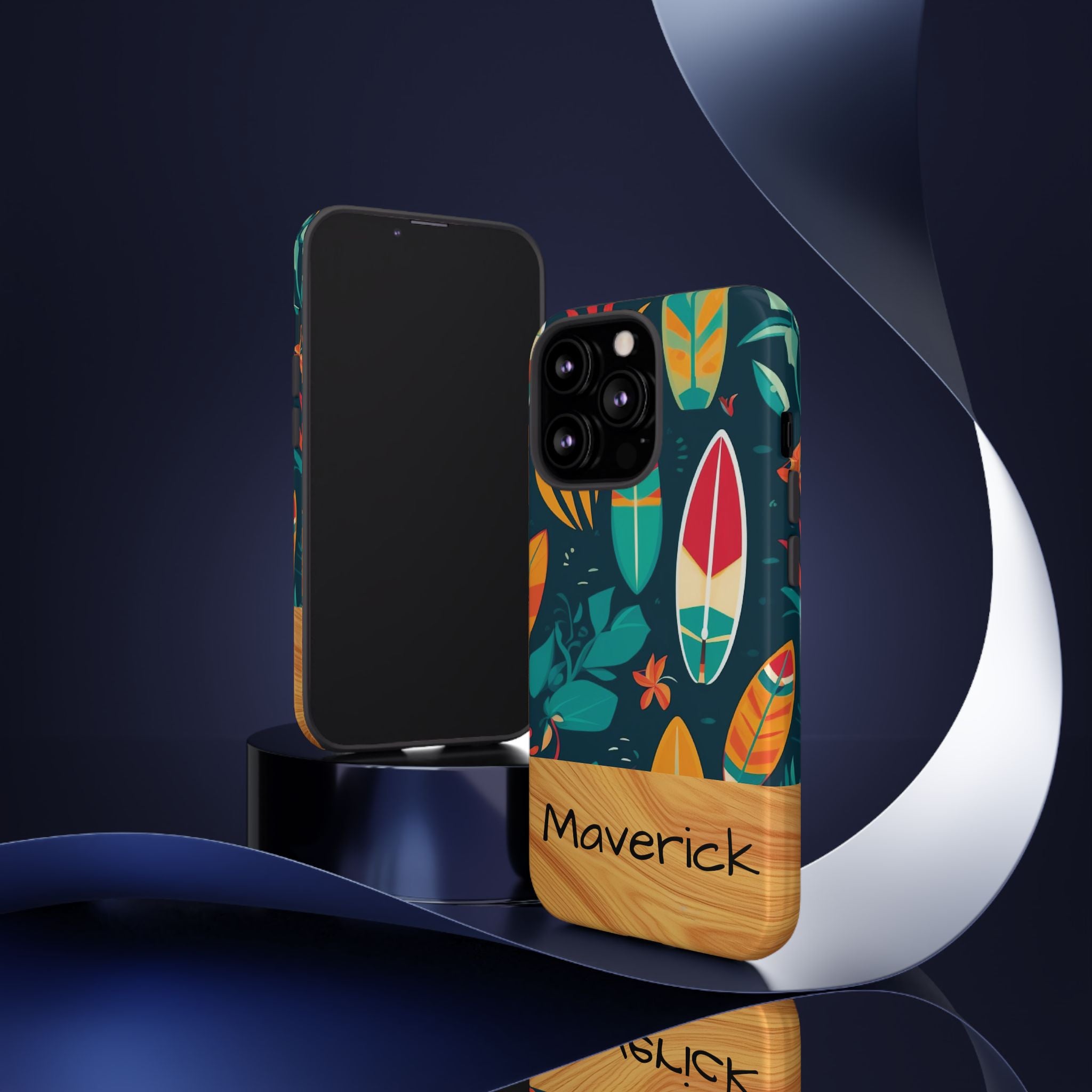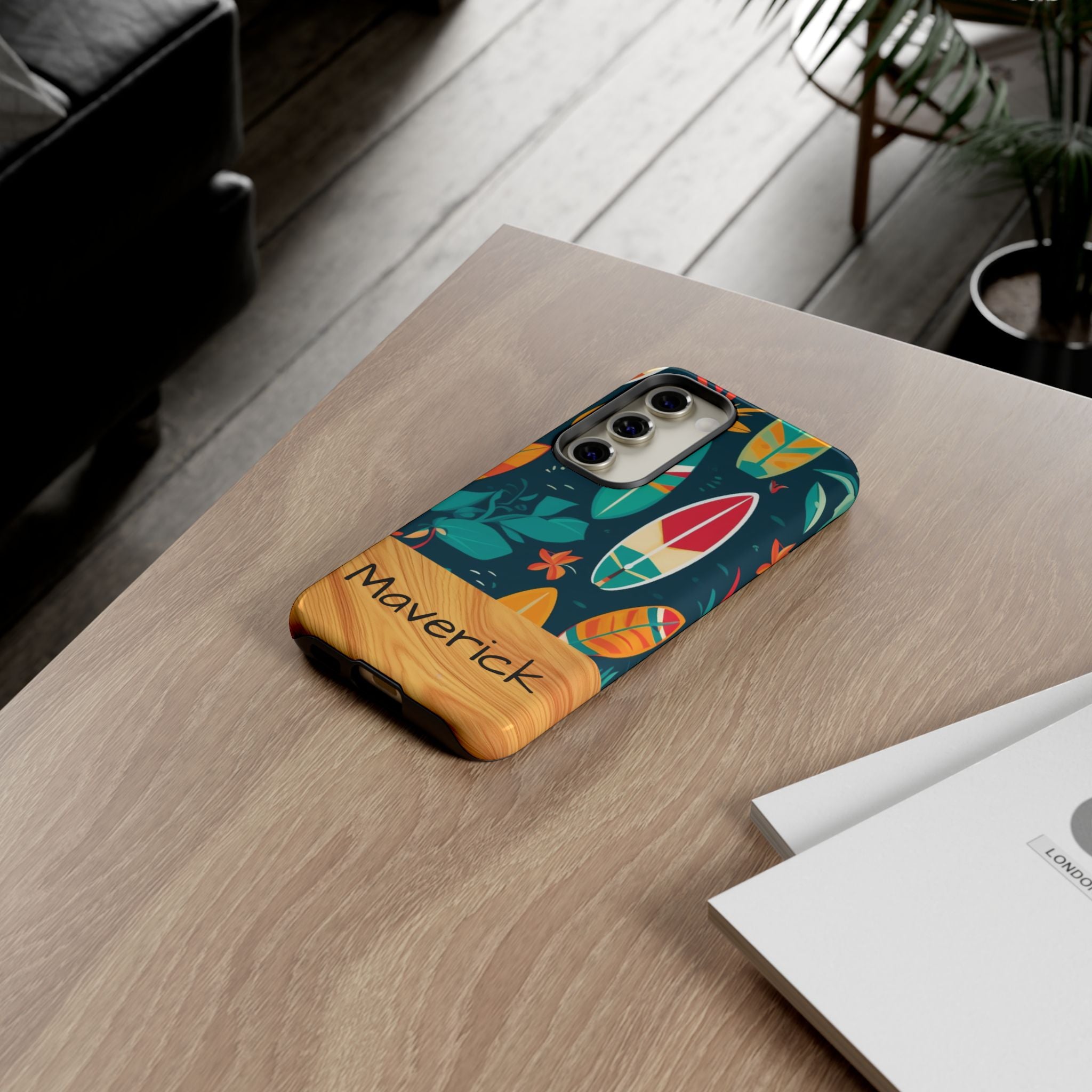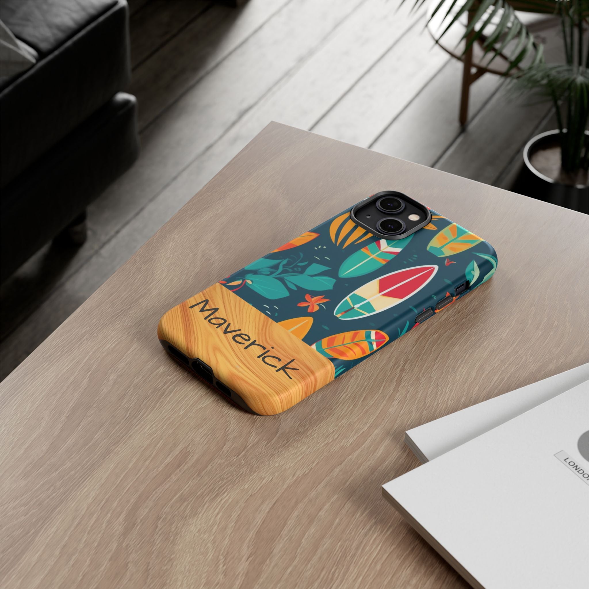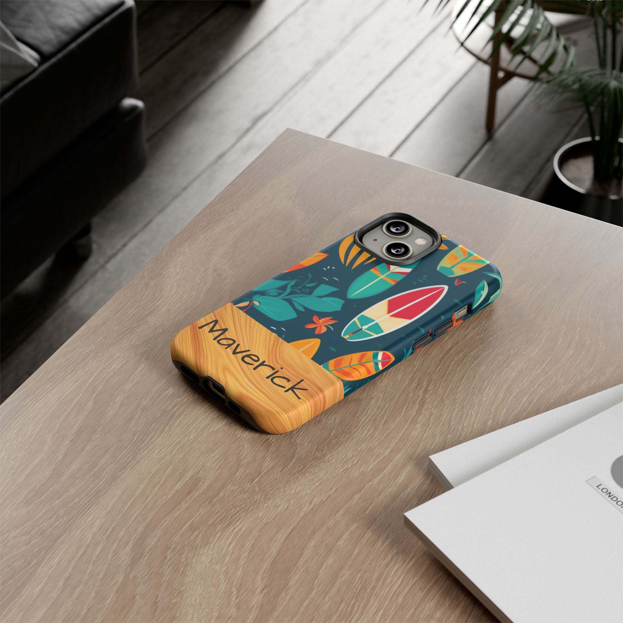 Custom Phone Tough Case Hawaii Surf Boards with Woodgrain Personalize with Name
