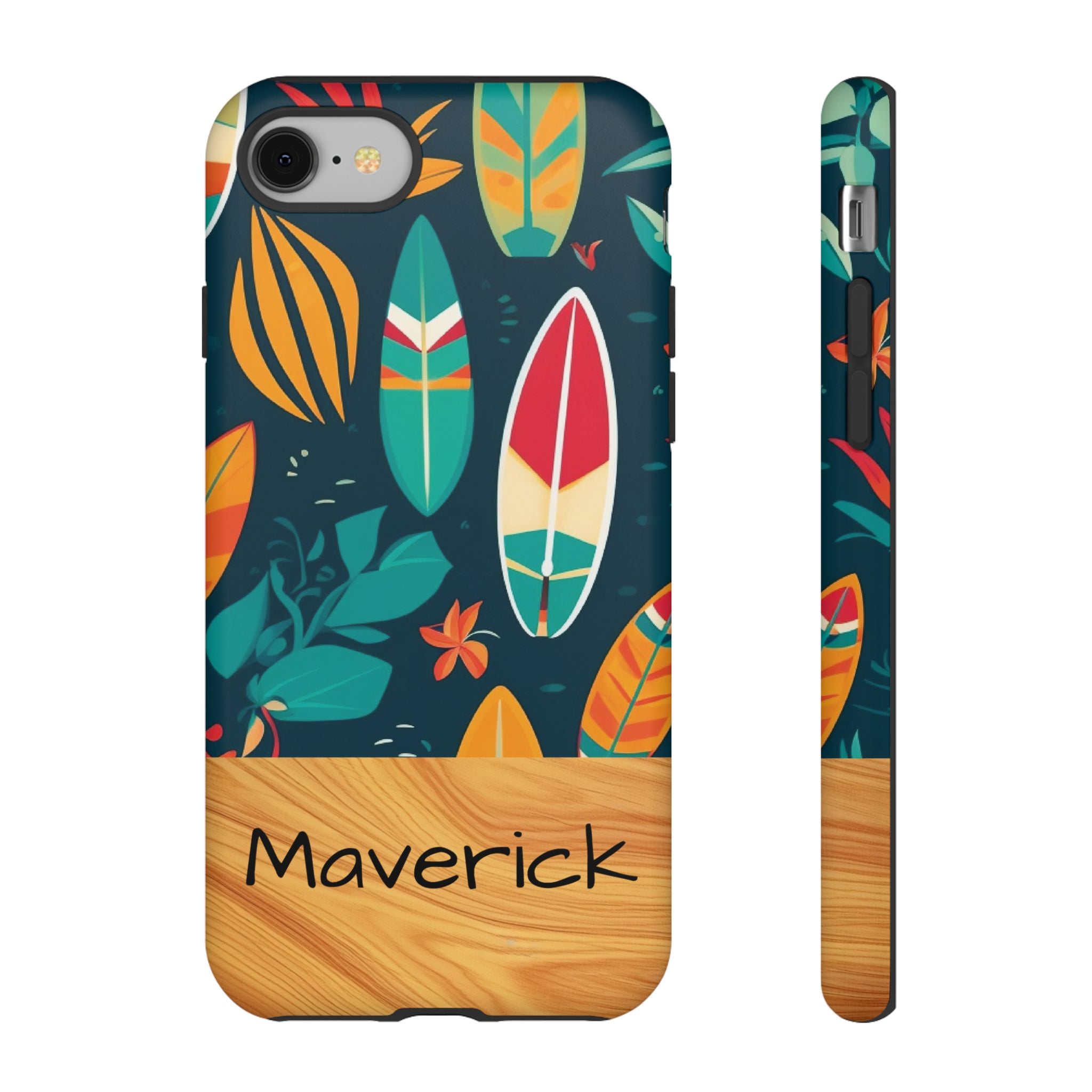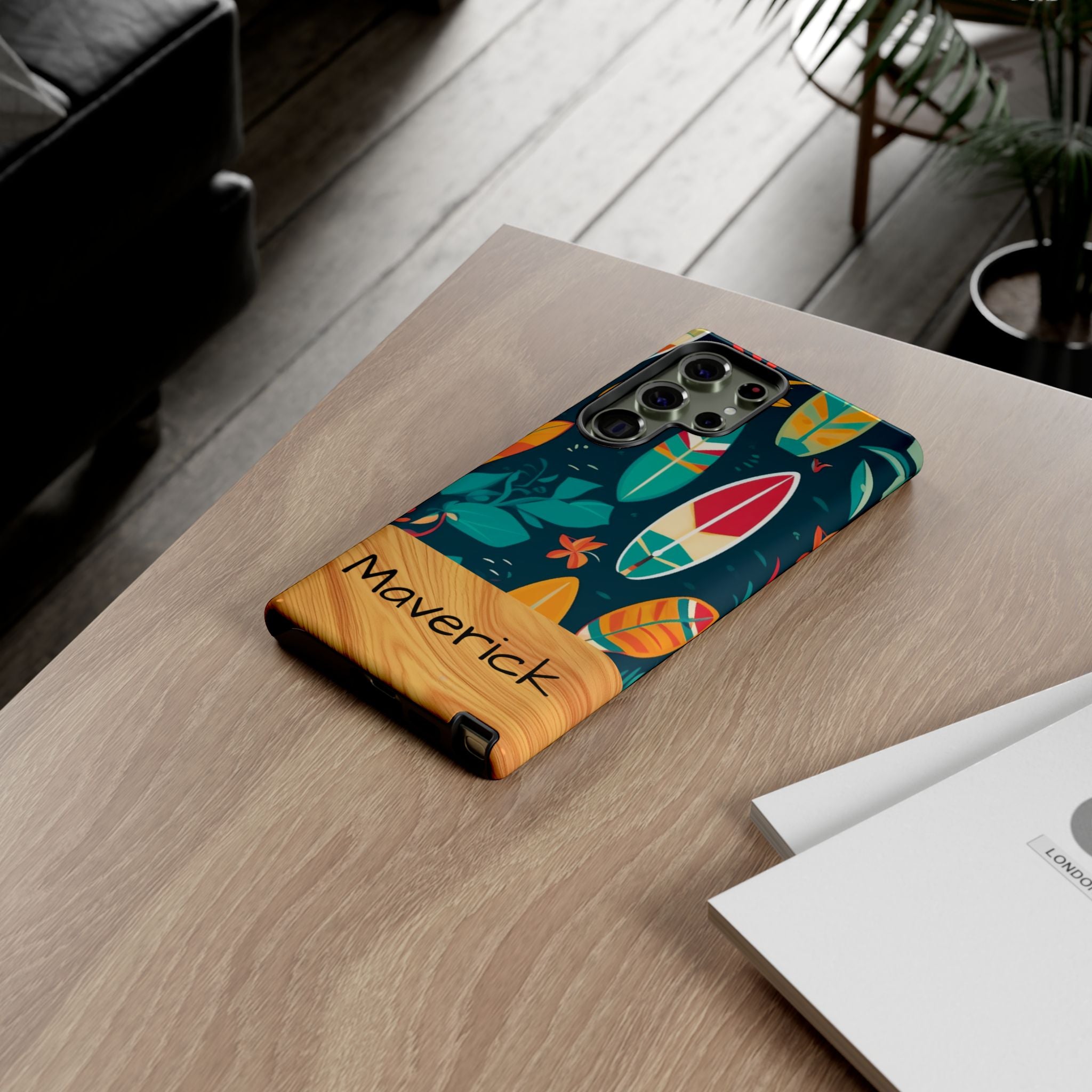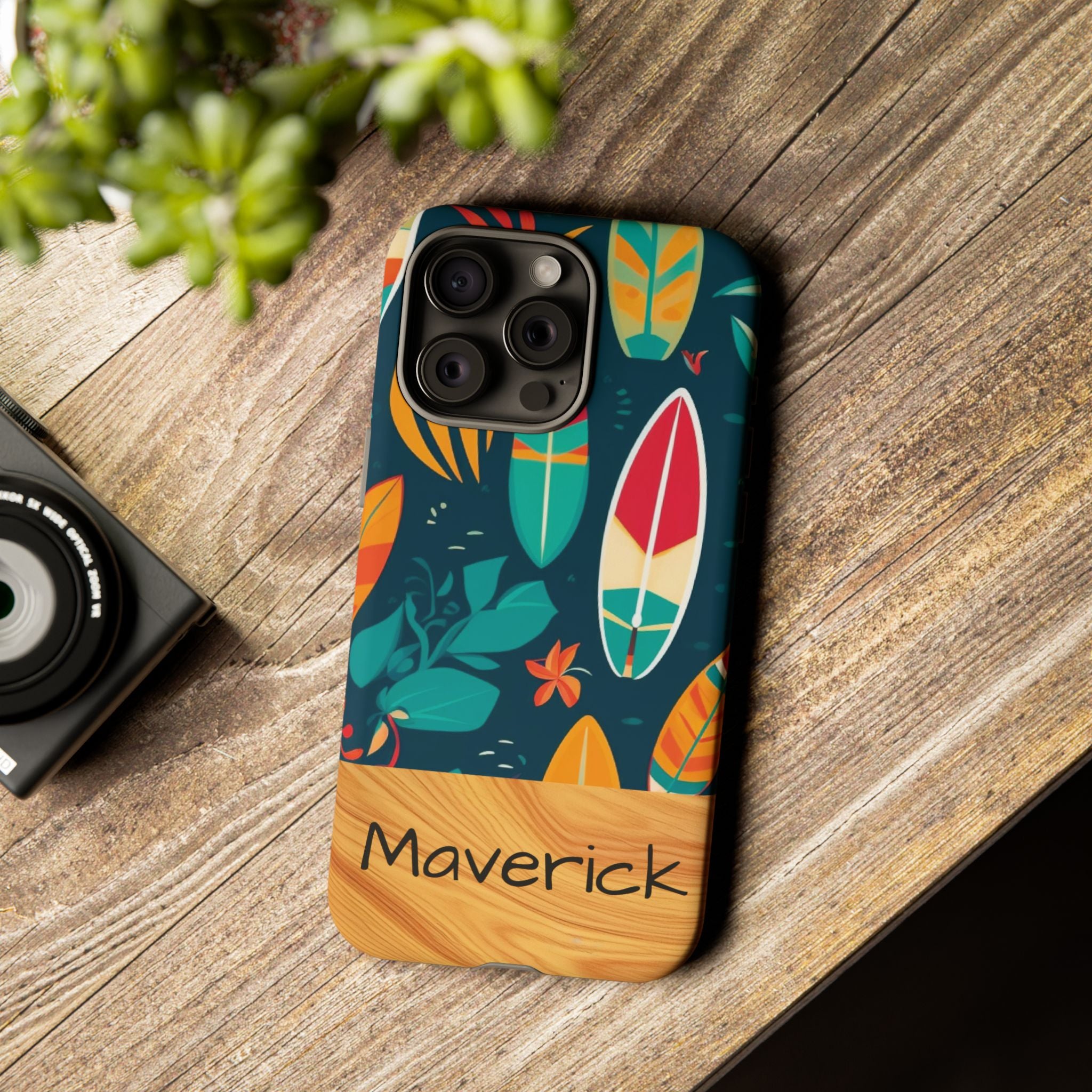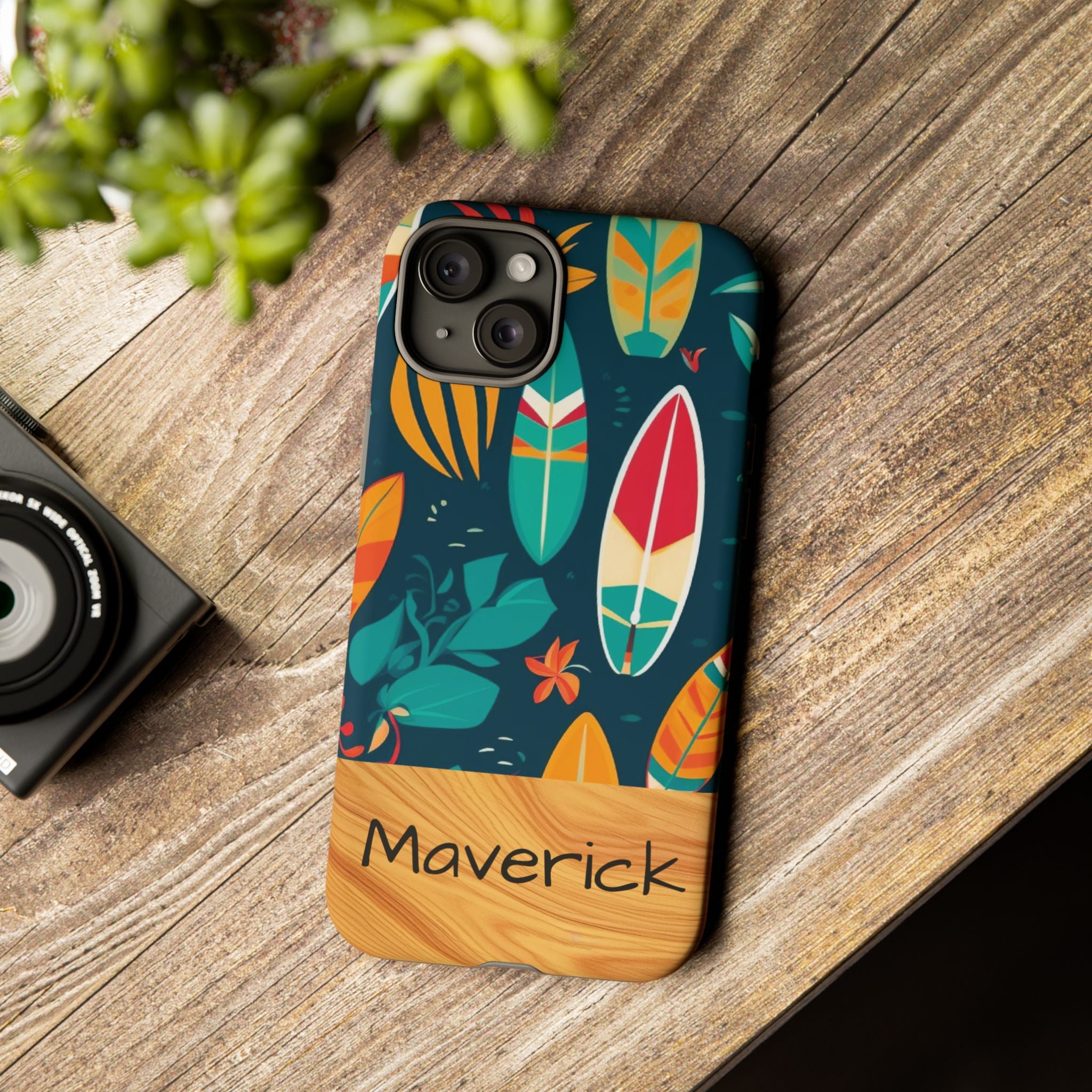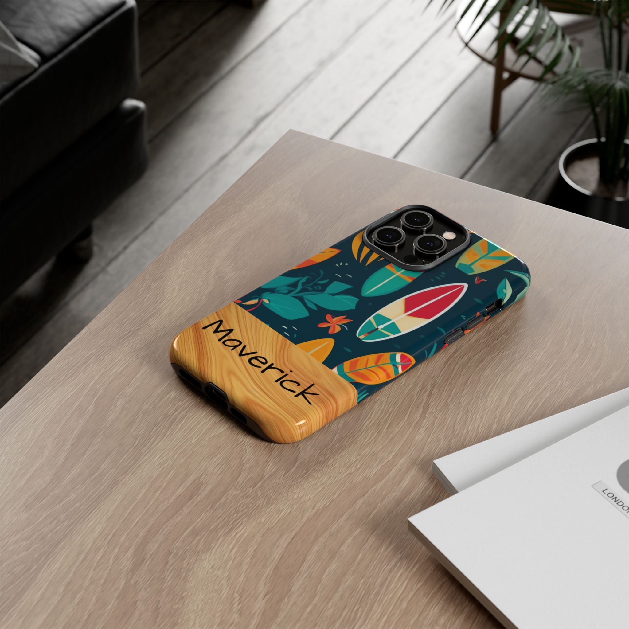 Custom Phone Tough Case Hawaii Surf Boards with Woodgrain Personalize with Name