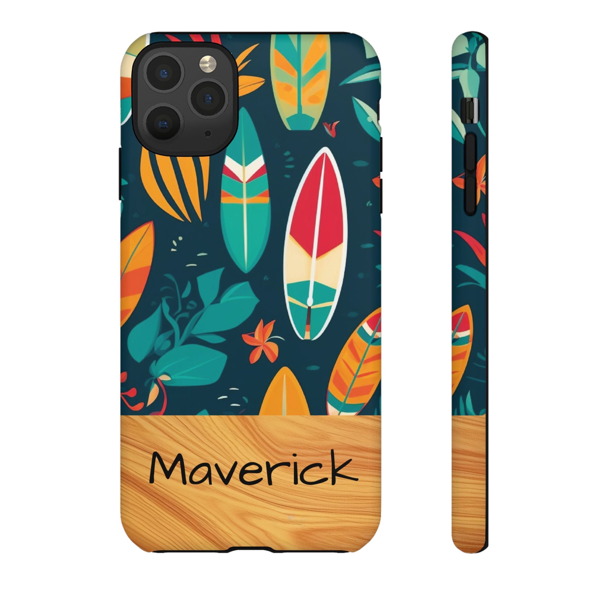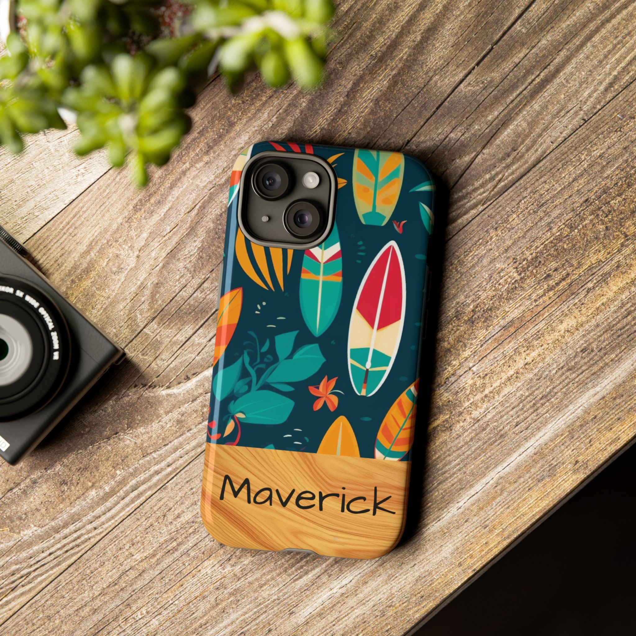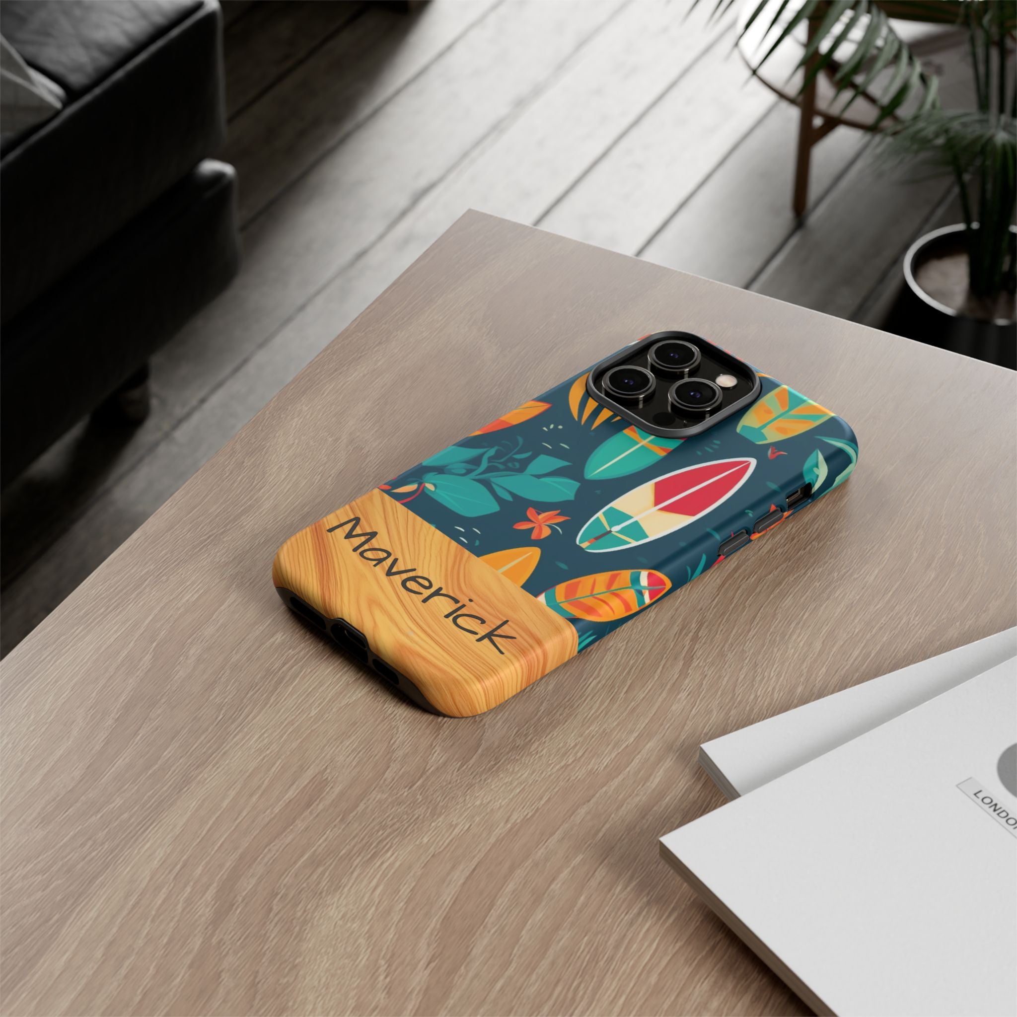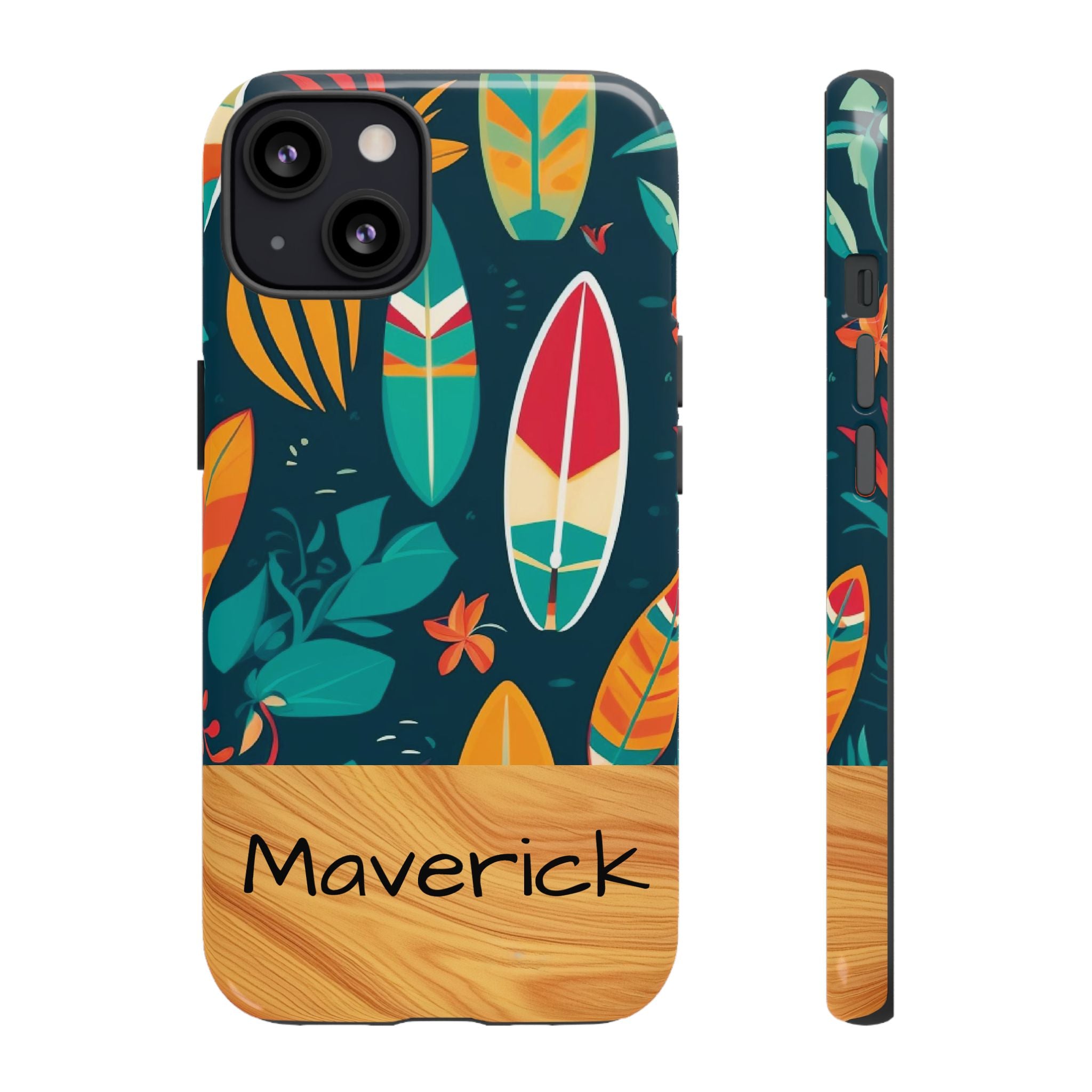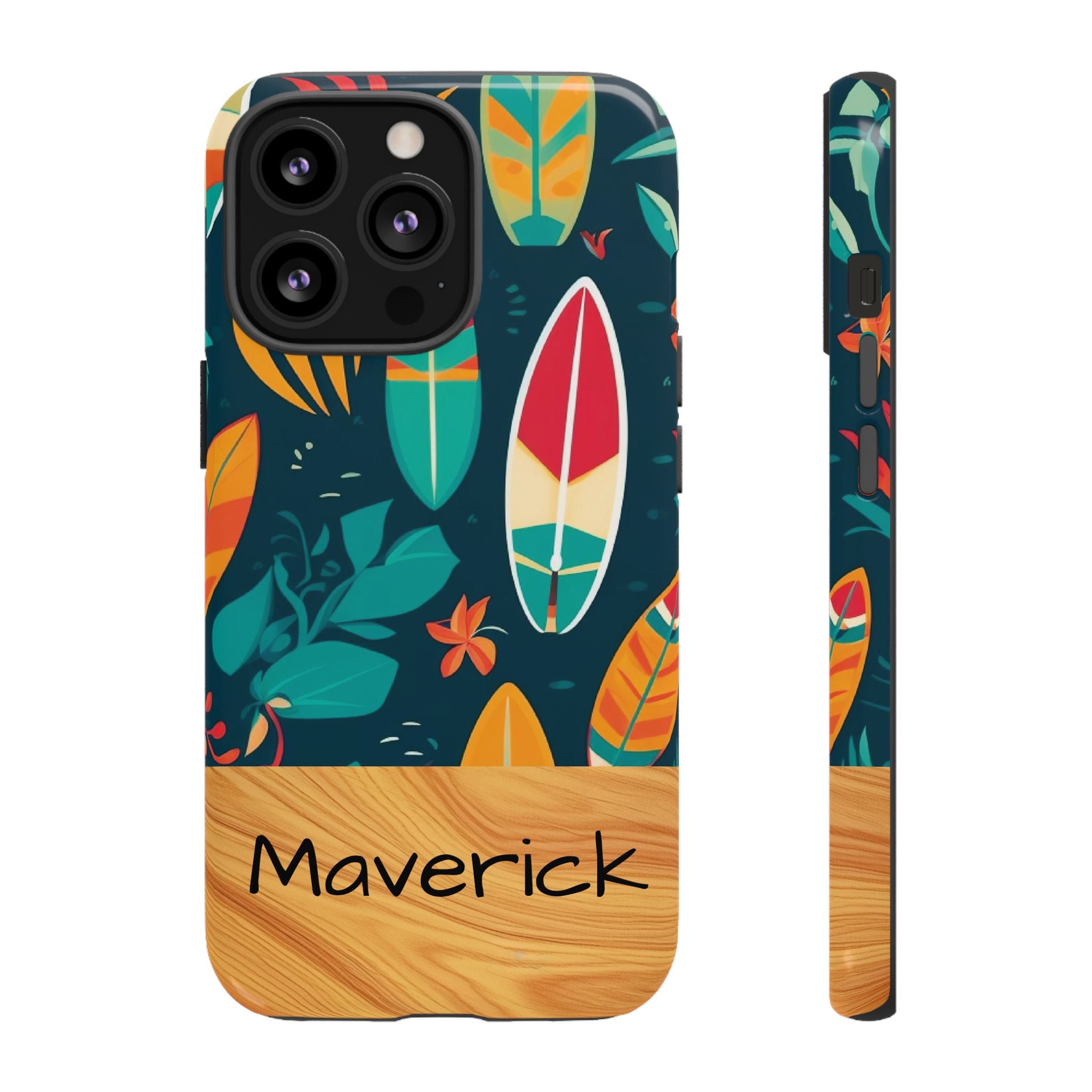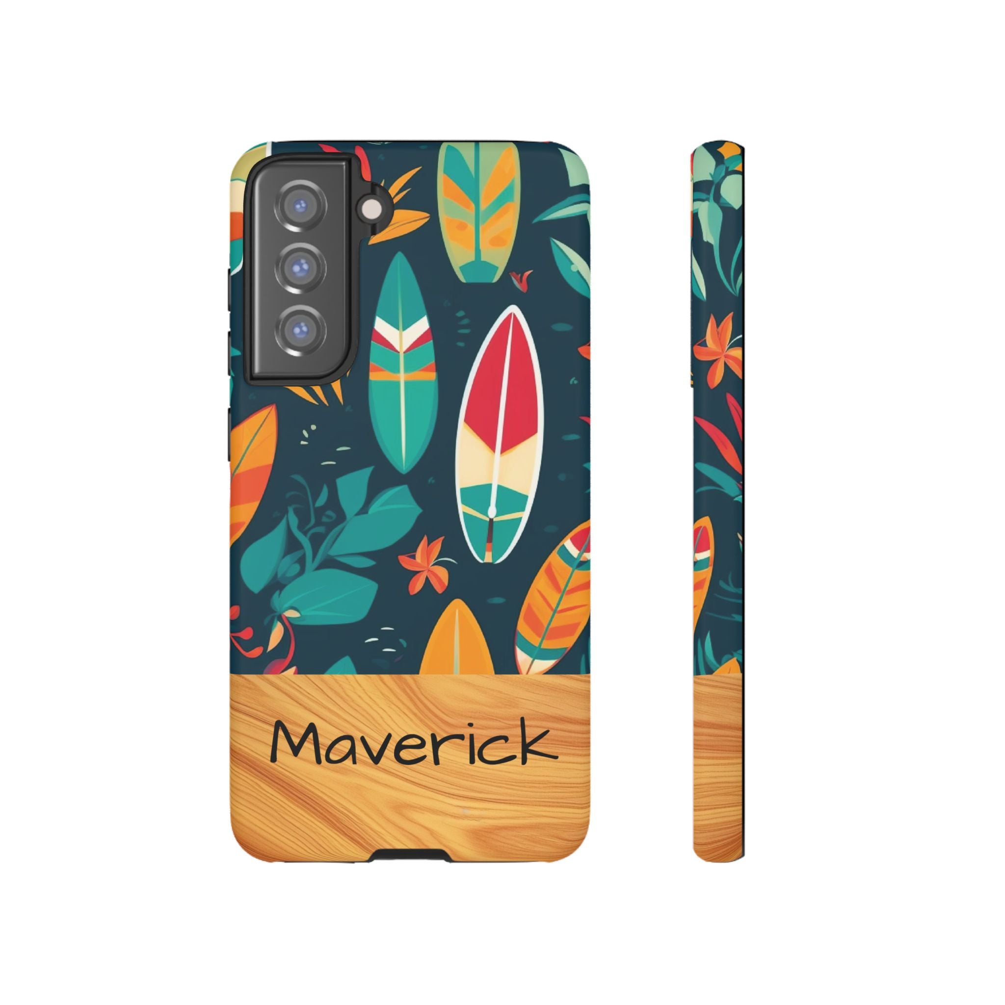 Custom Phone Tough Case Hawaii Surf Boards with Woodgrain Personalize with Name