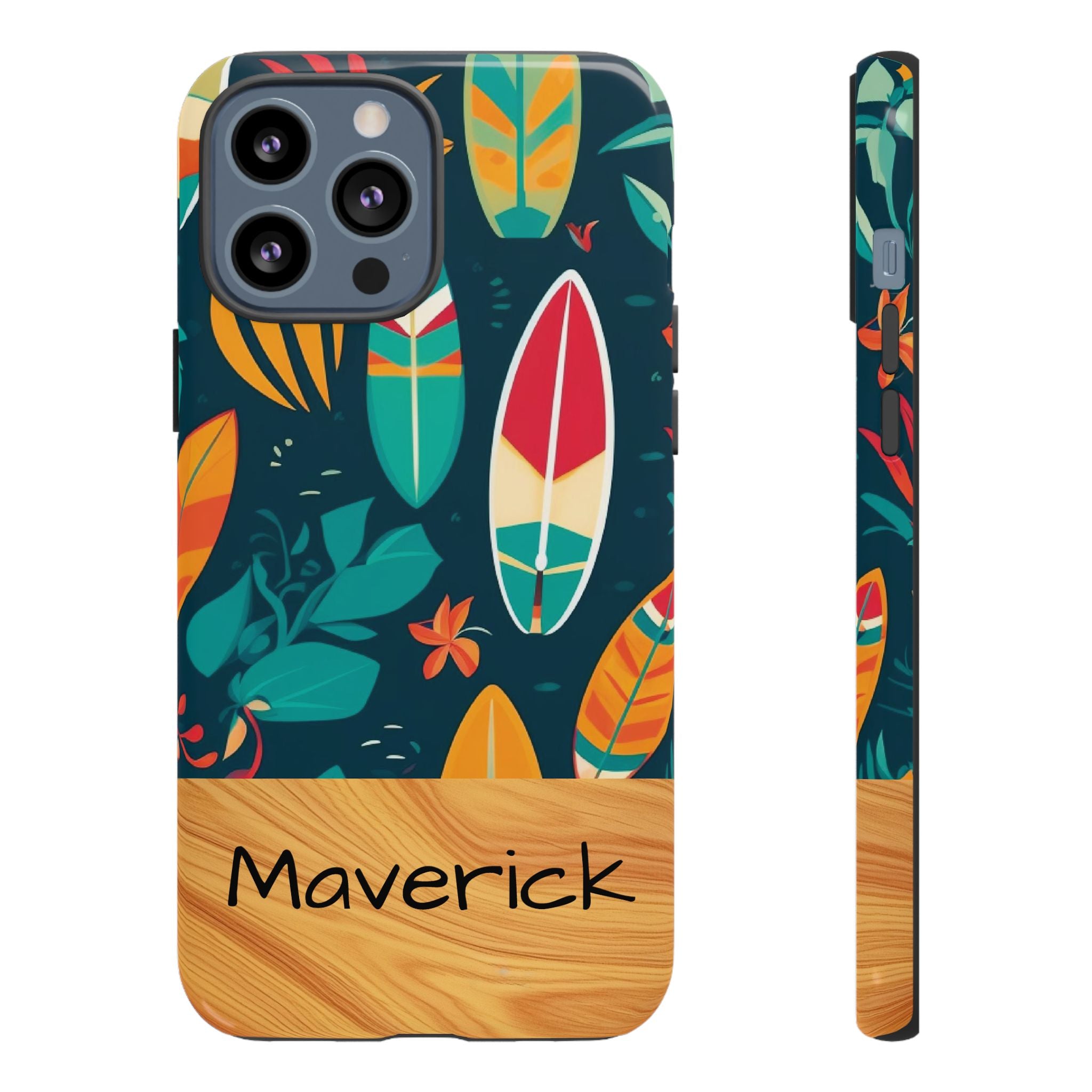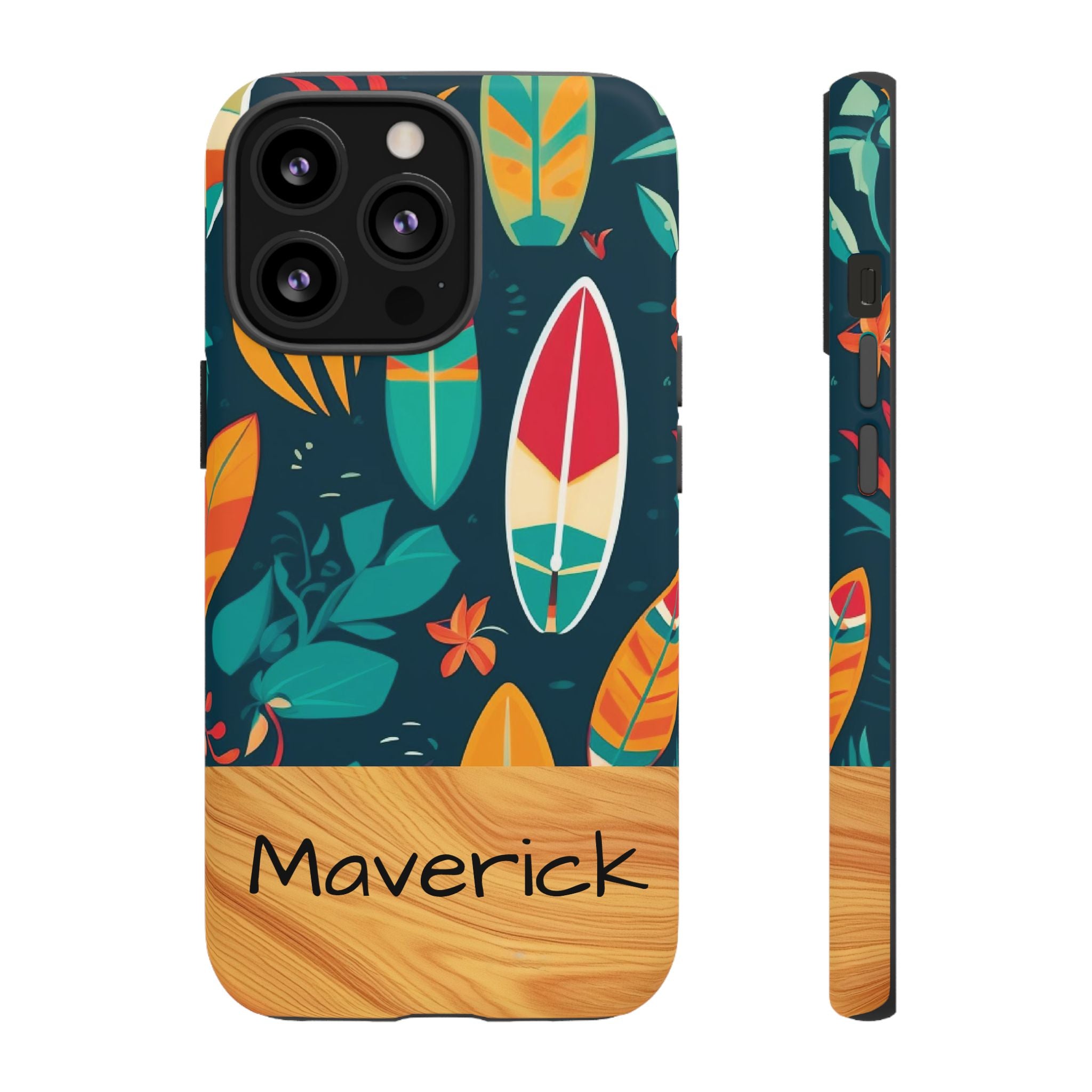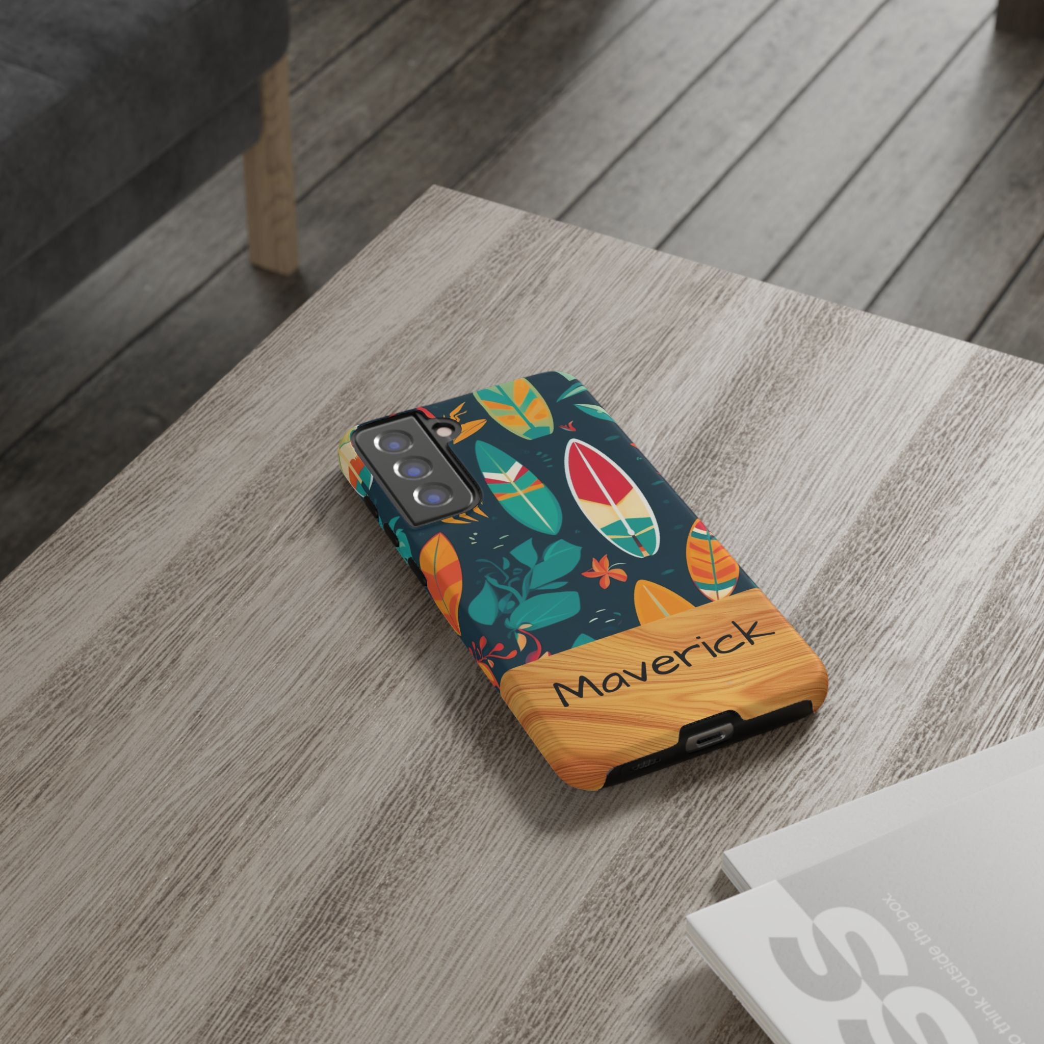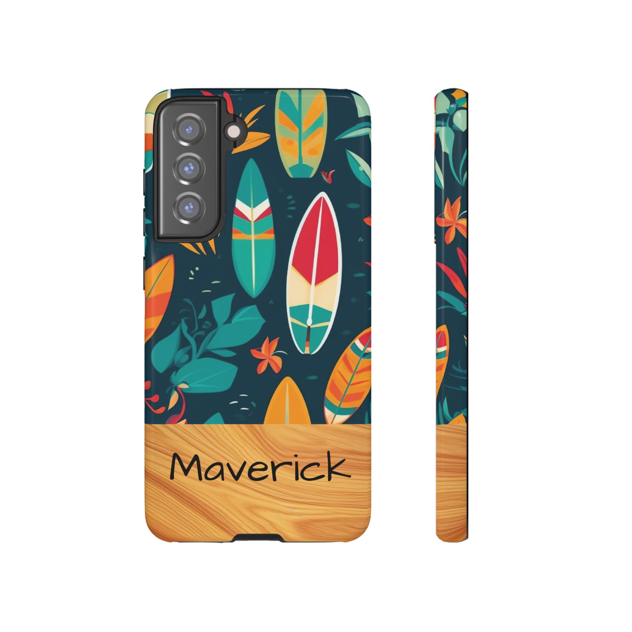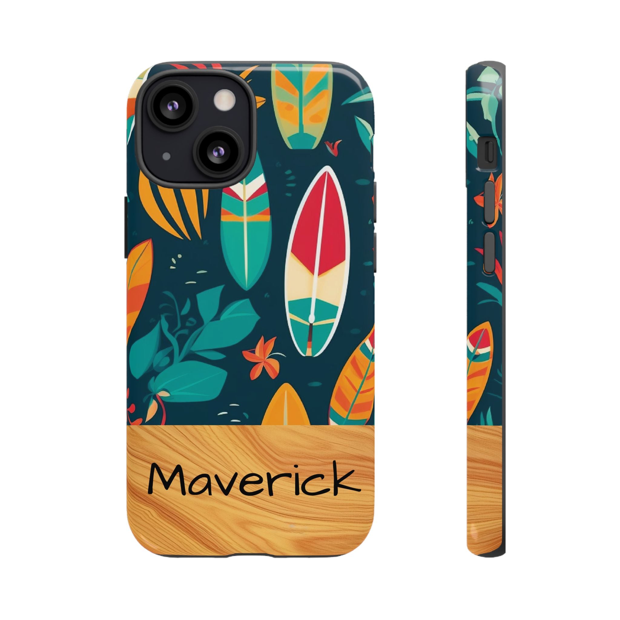 Custom Phone Tough Case Hawaii Surf Boards with Woodgrain Personalize with Name