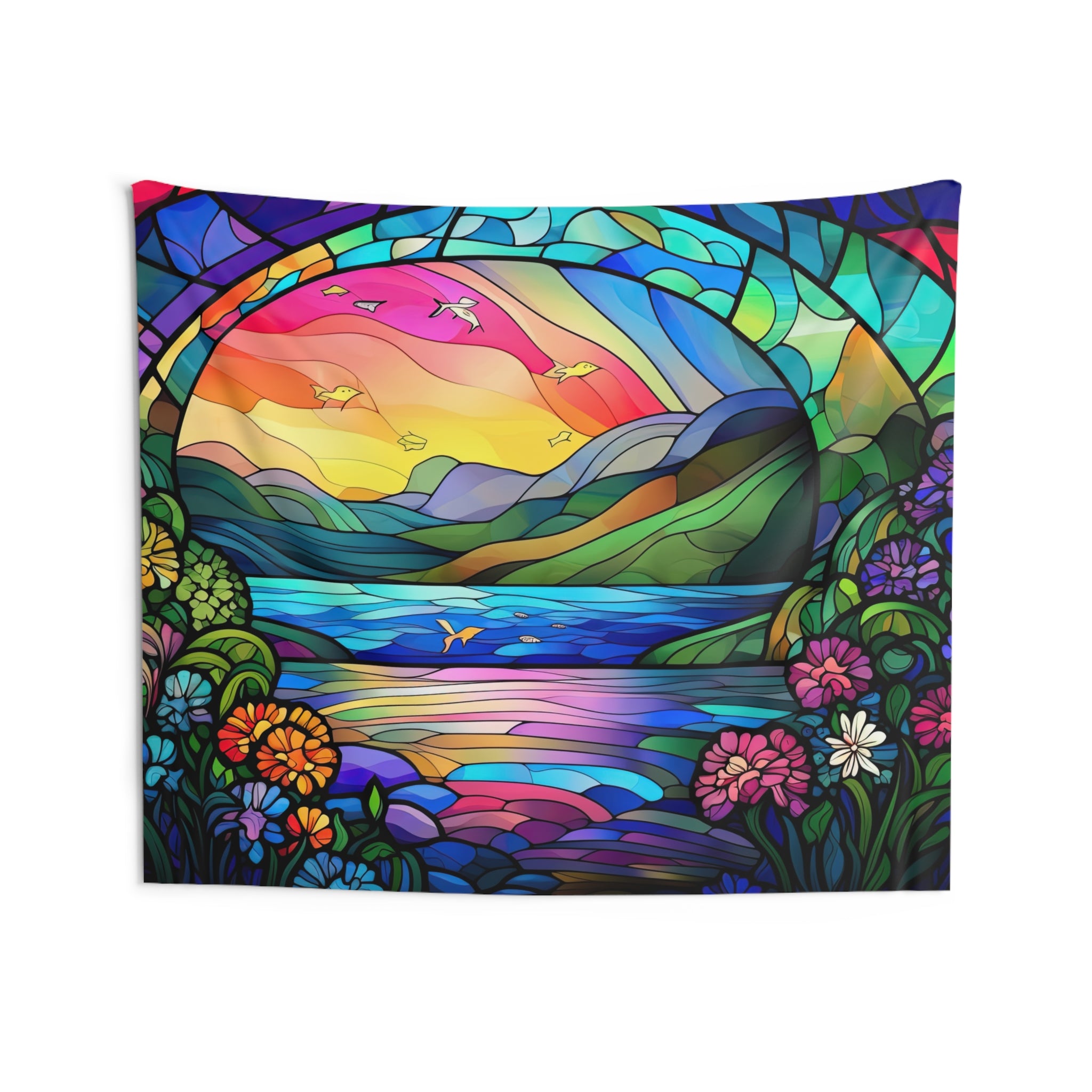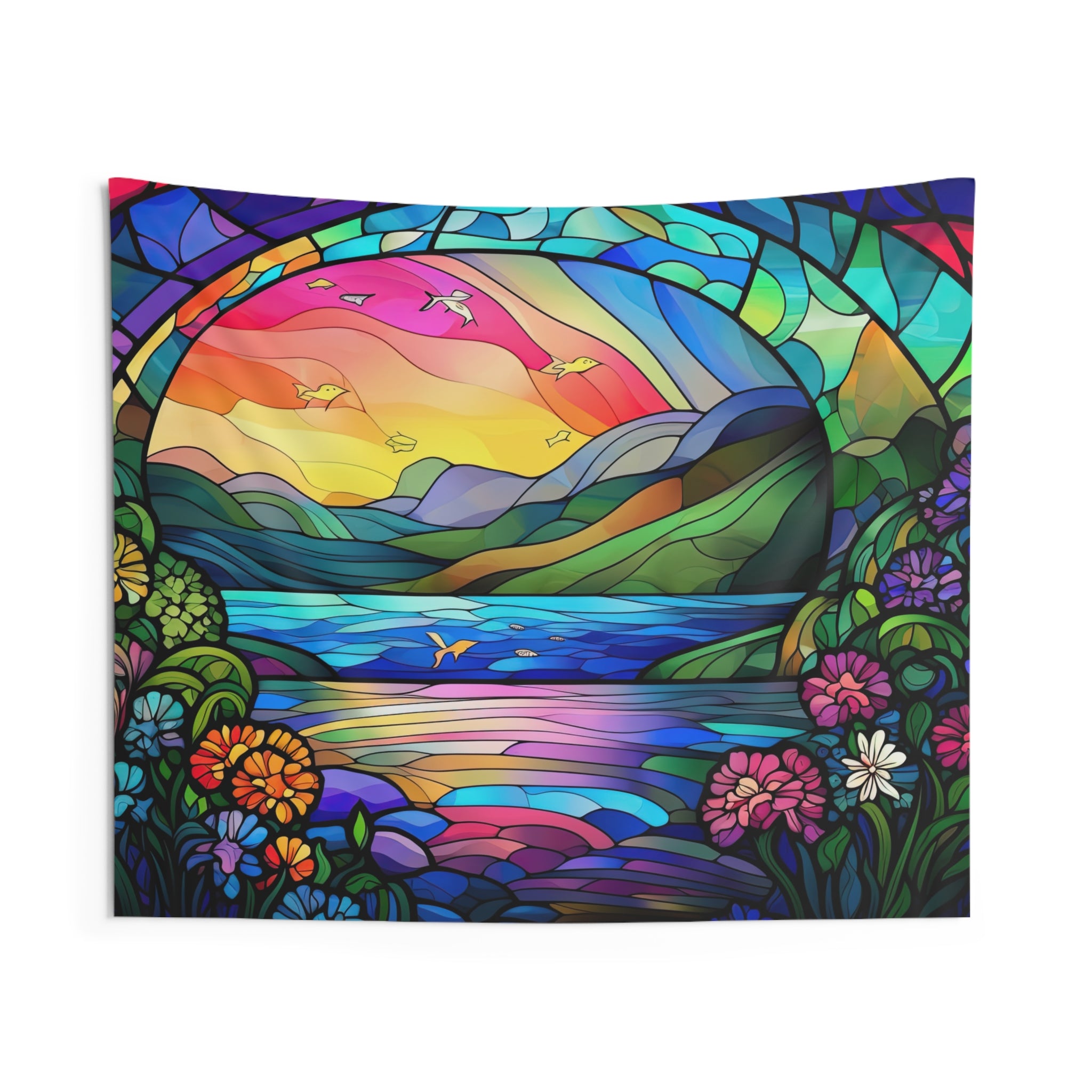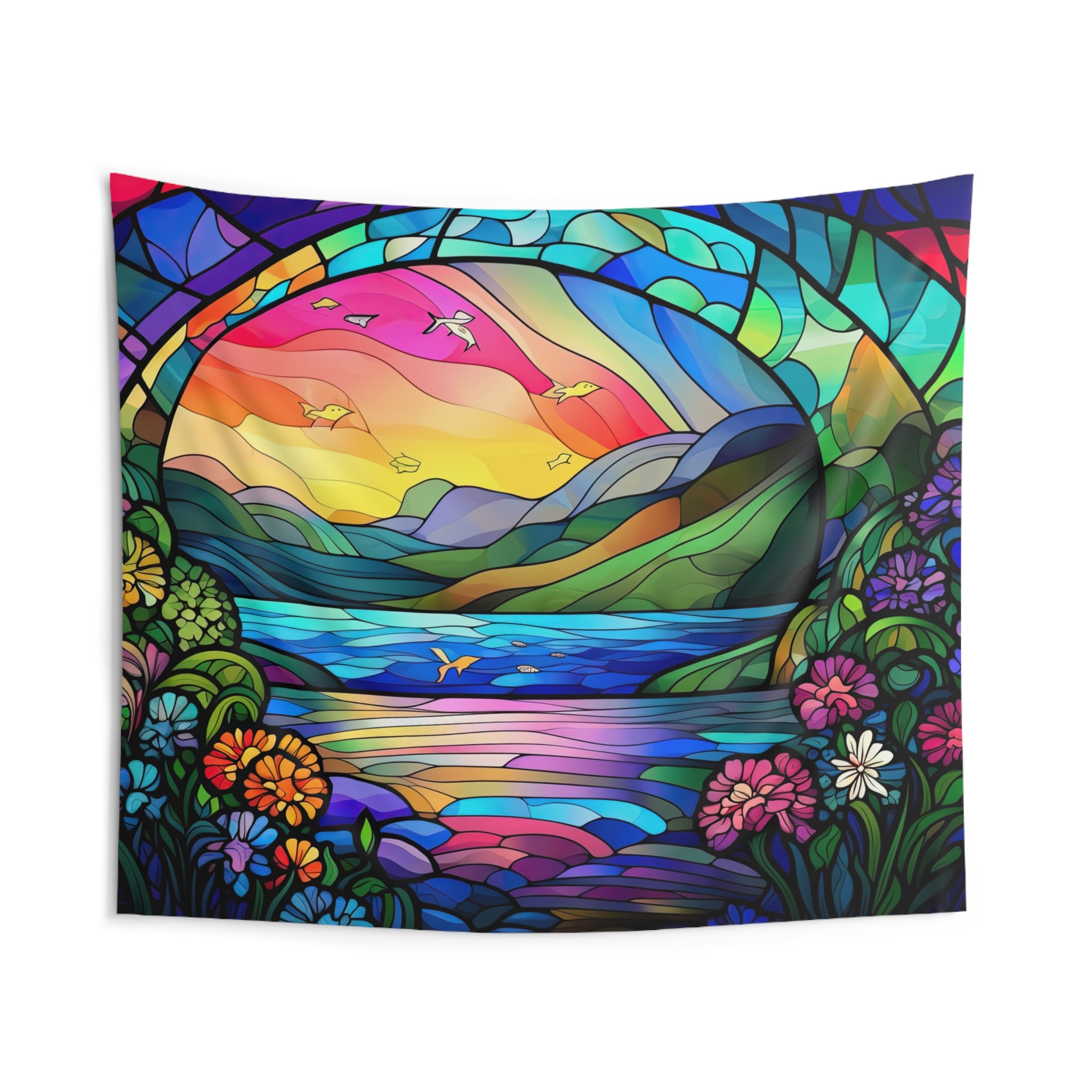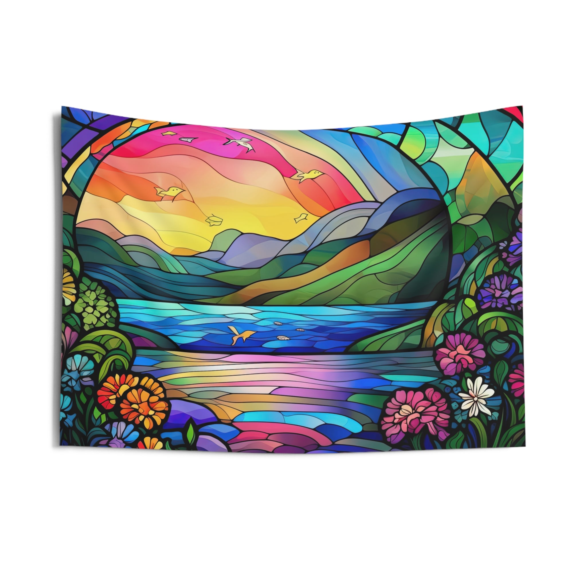Indoor Wall Tapestry Stain Glass Look River Mountain Art View
