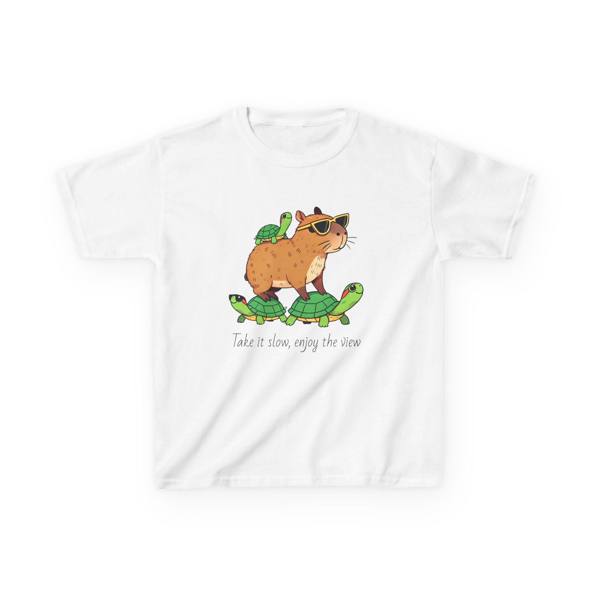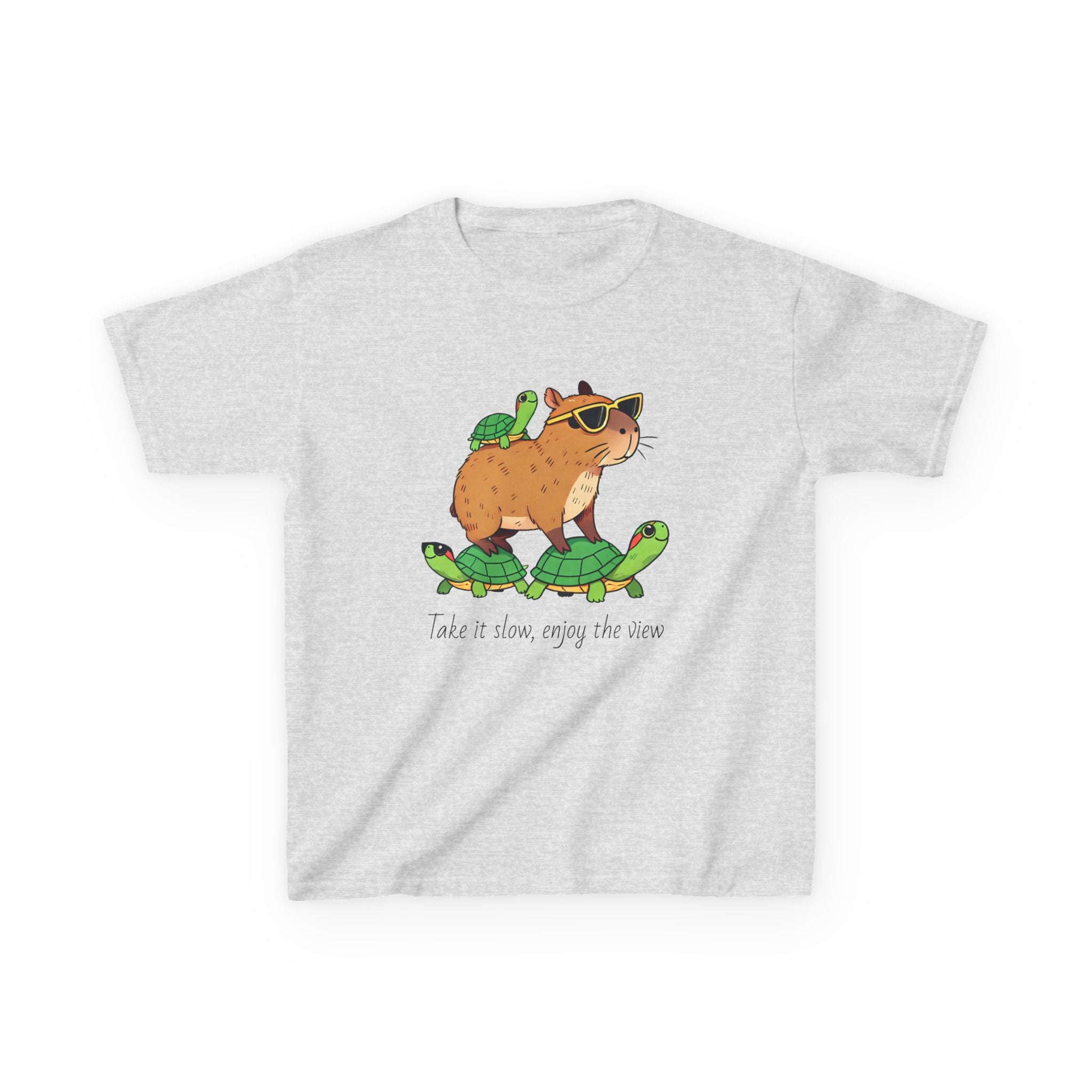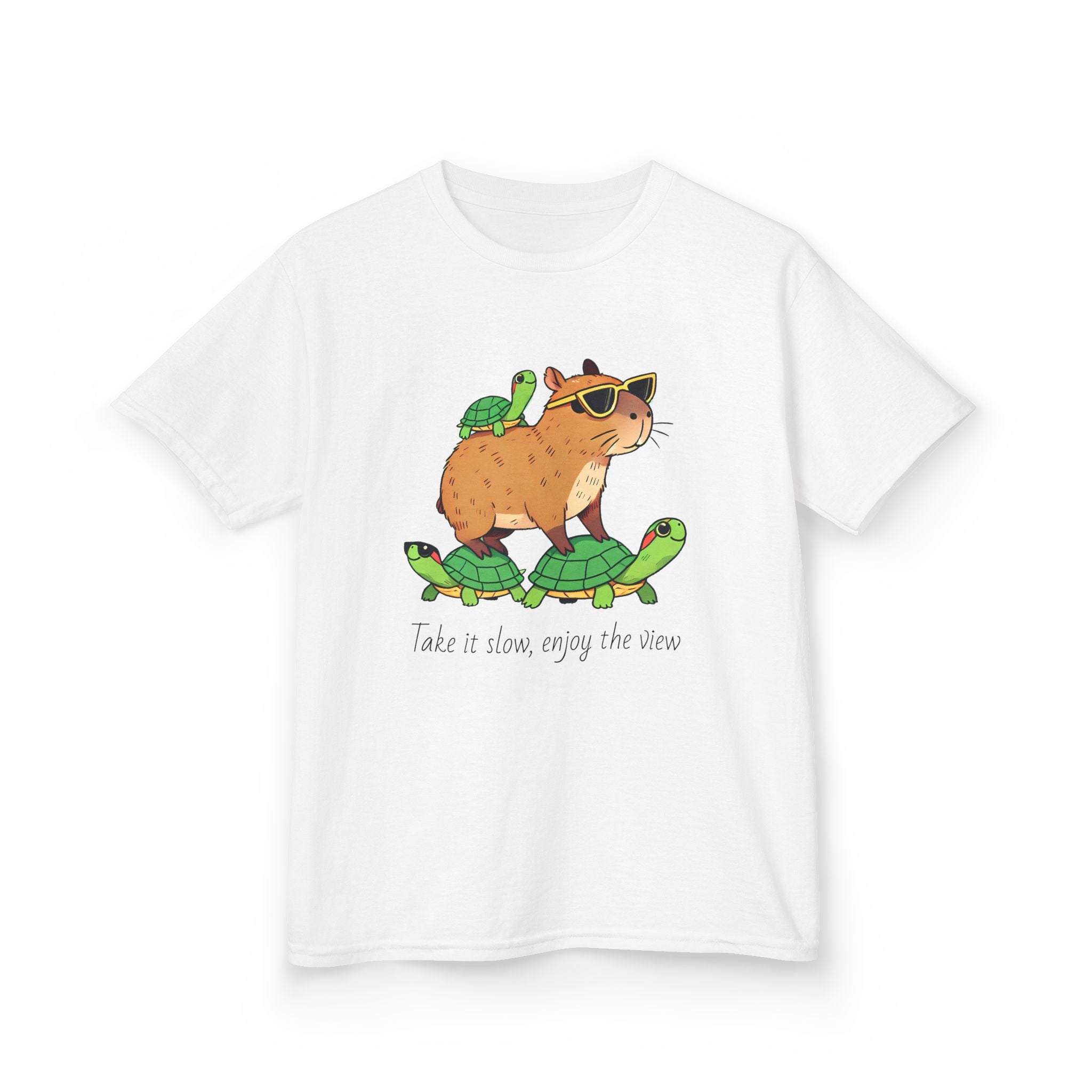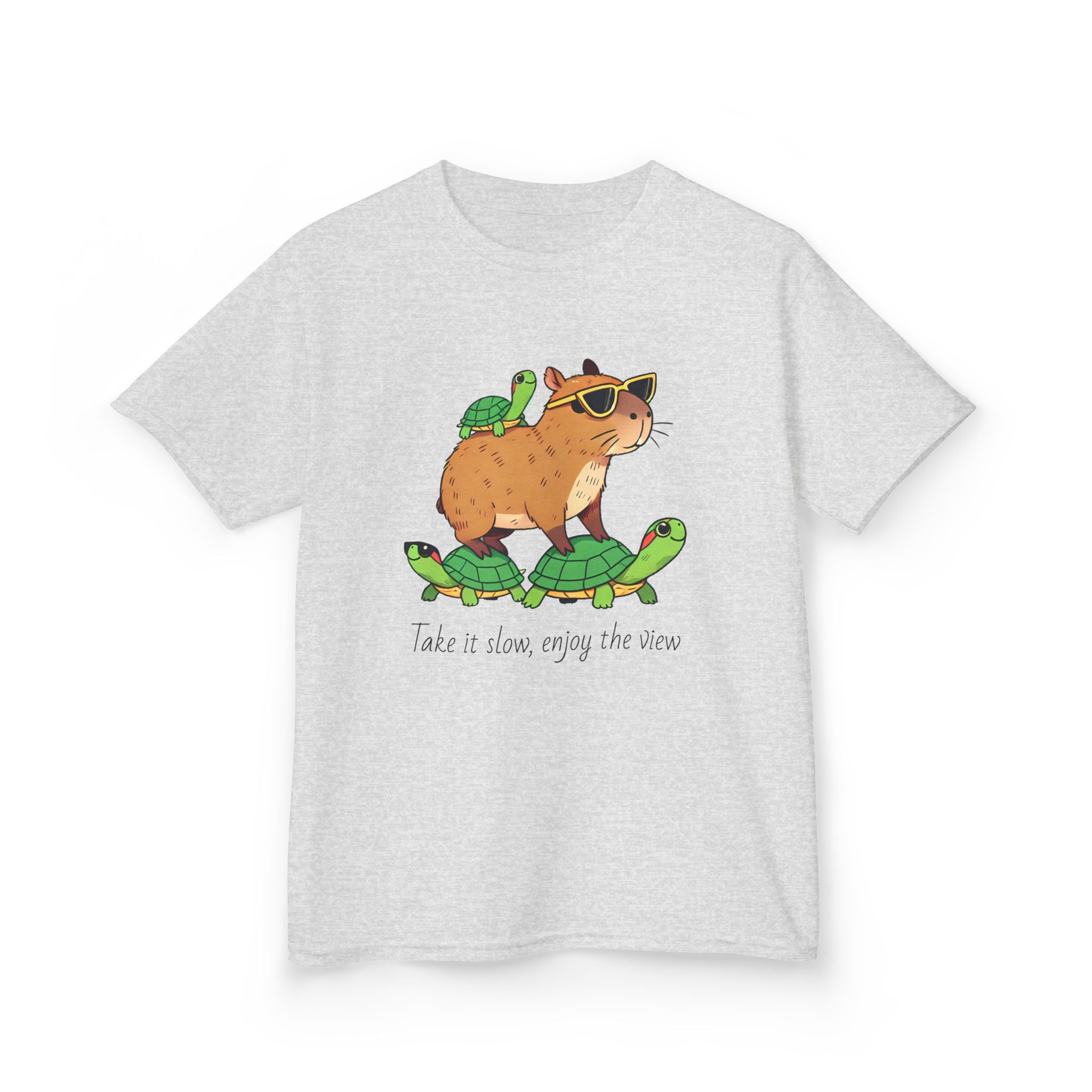 This Kids Tee featuring a Capybara Riding on Turtles design is cute and playful, perfect for adding a fun touch to a child's wardrobe. The soft cotton fabric and classic fit make it comfortable for daily wear, suitable for kids who love adorable animals and whimsical designs. Ideal for birthdays, playdates, and casual outings.