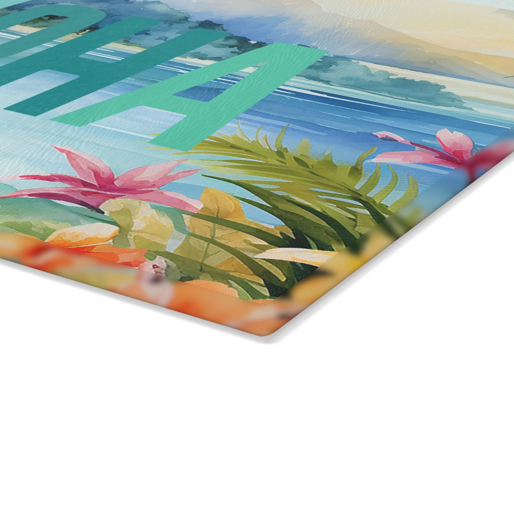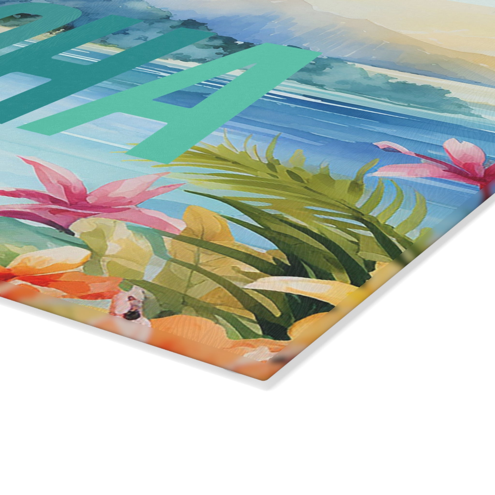 Aloha Tropical Beach Scene Glass Cutting Board | Hawaiian Floral Ocean Art