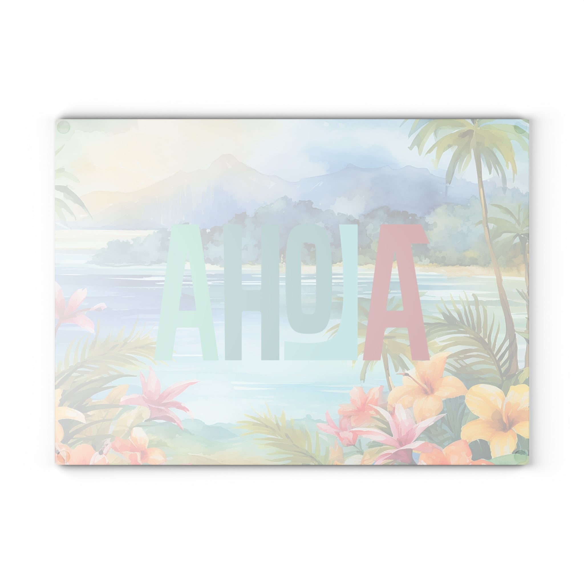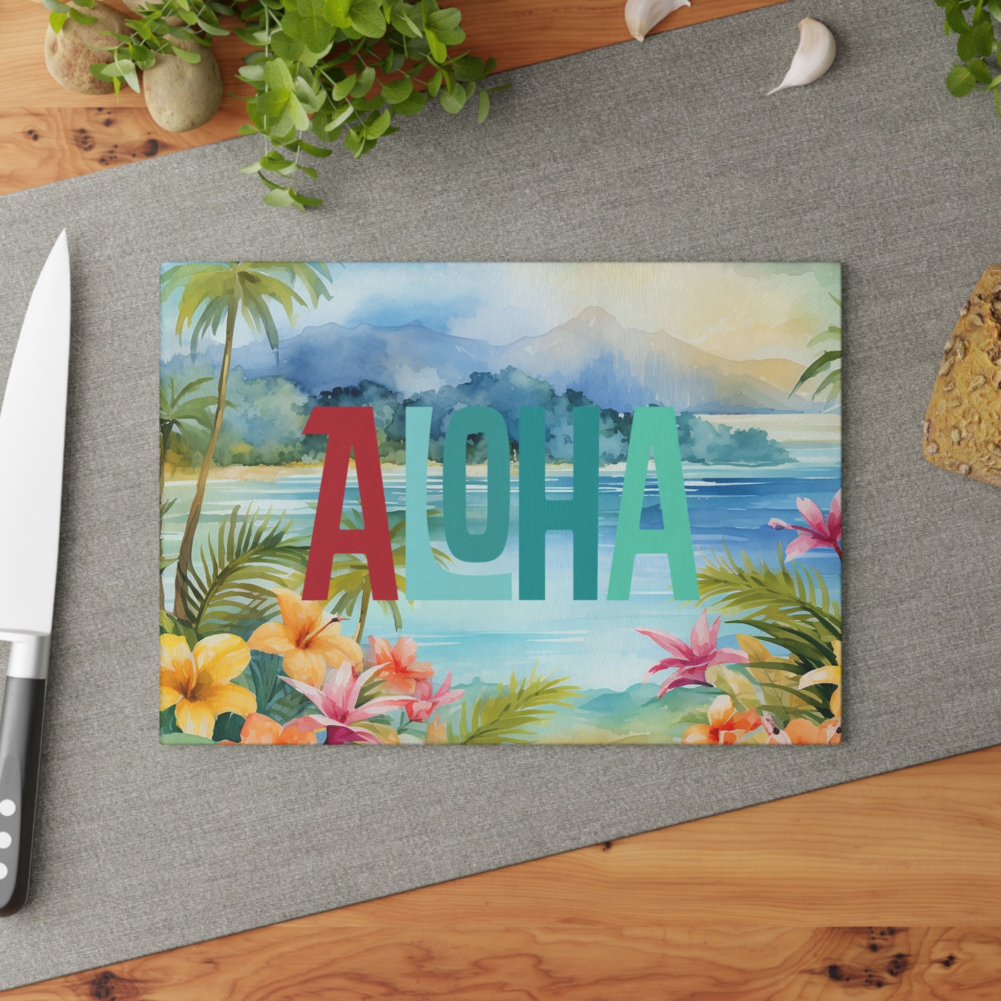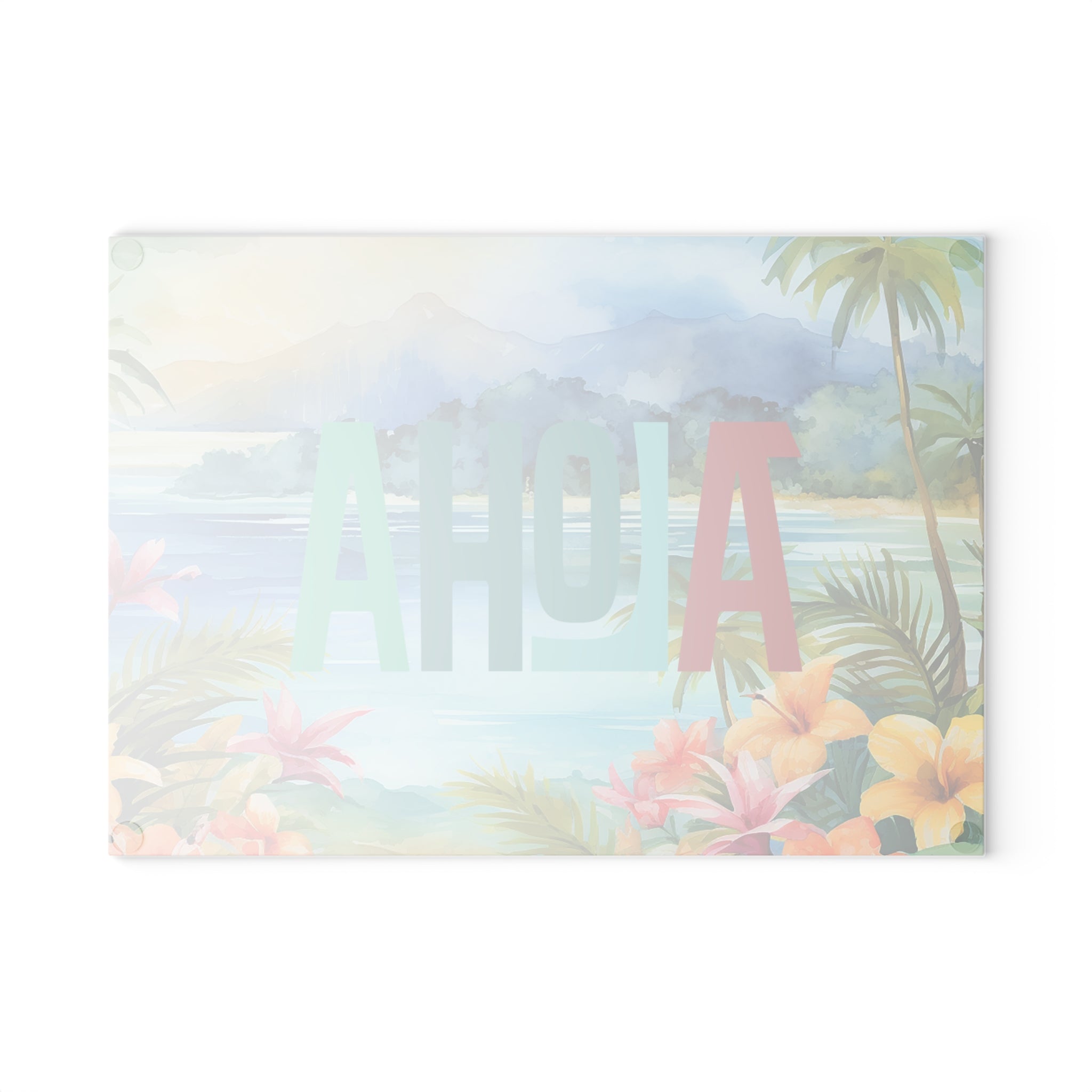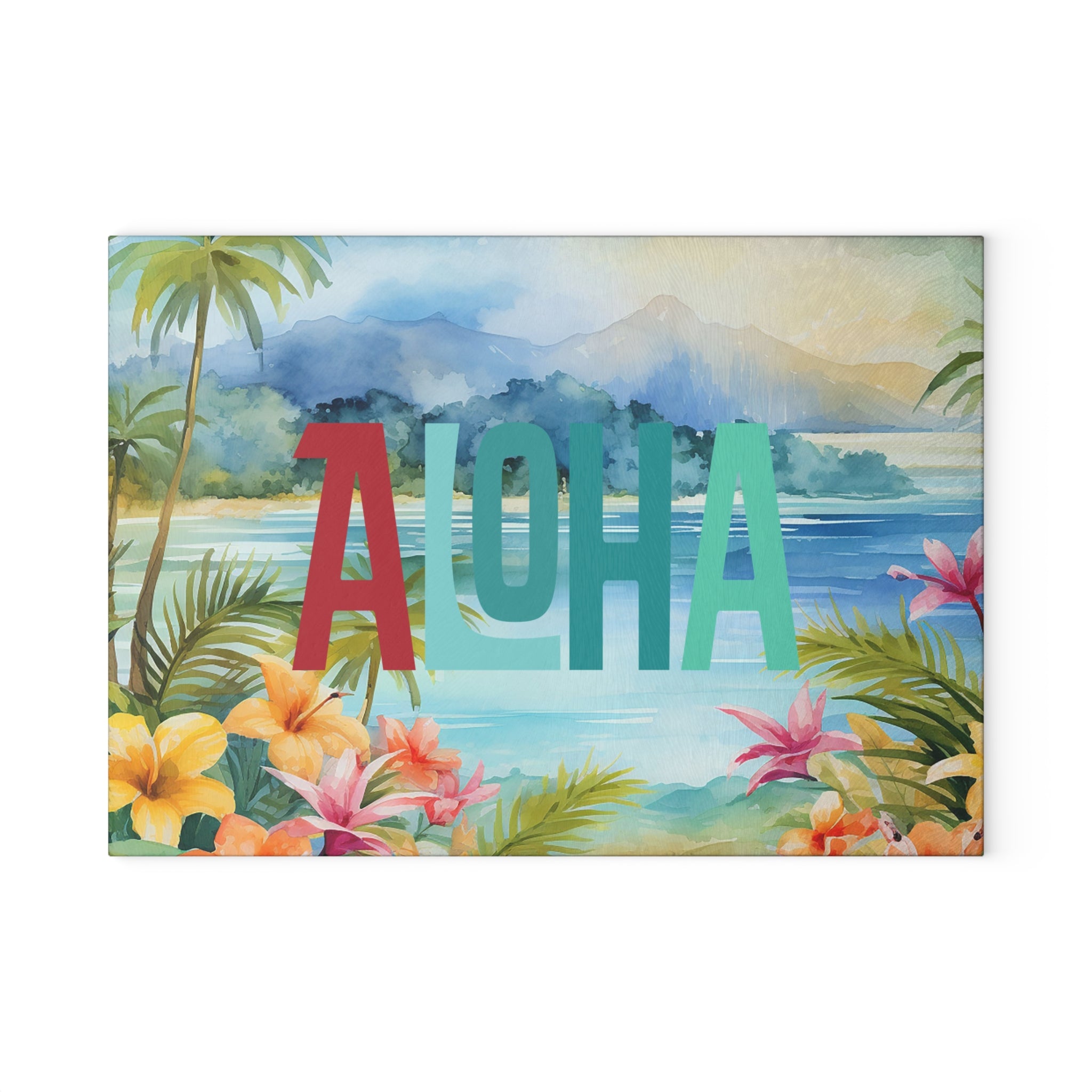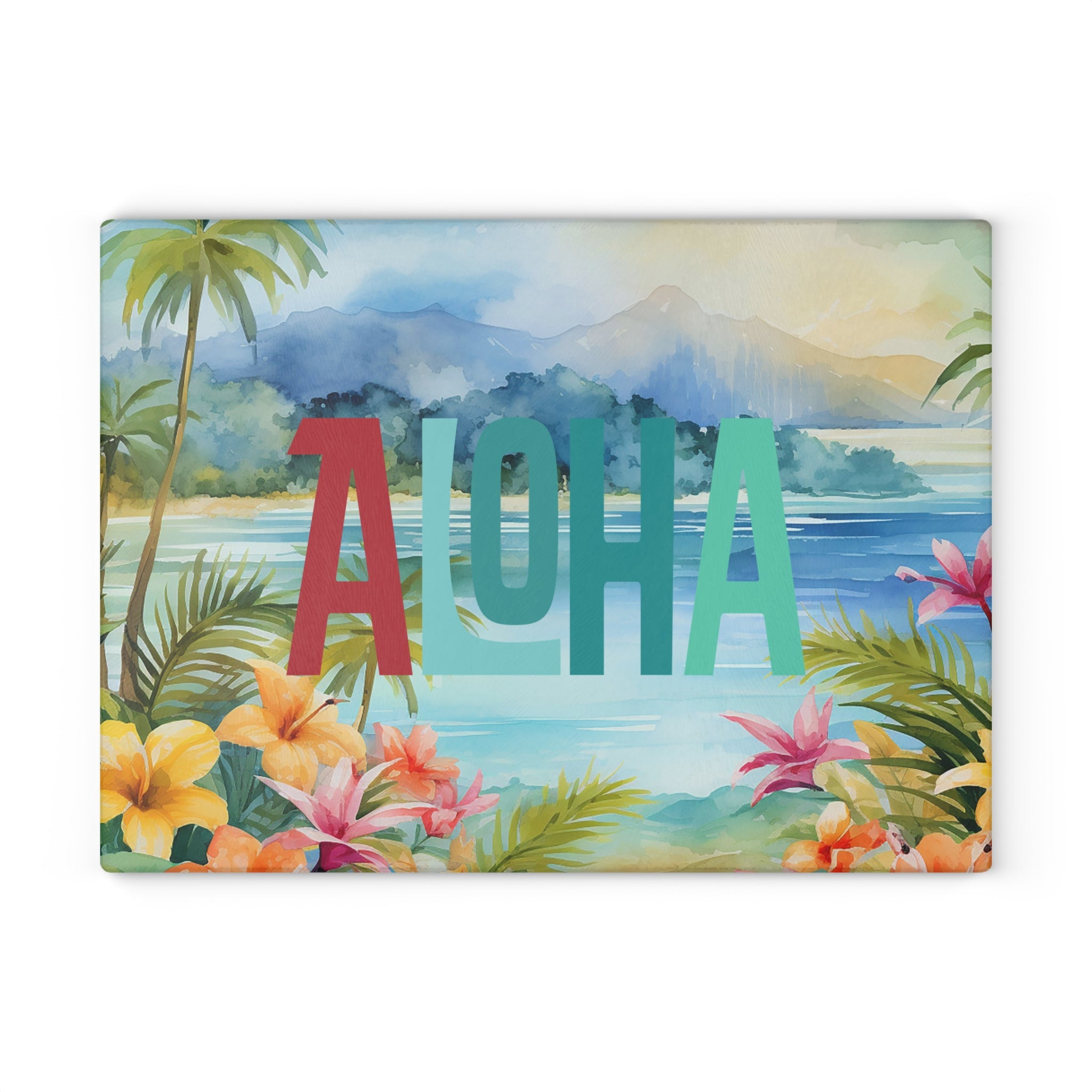 A vibrant tempered glass cutting board that brings a slice of island calm to your kitchen. Lush watercolor palms, hibiscus blooms, and a misty mountain backdrop set the scene while bold, layered “ALOHA” lettering adds cheerful contrast. The smooth, textured glass surface feels crisp under the knife and the durable printed artwork resists scratching so the scene stays bright through meal prep. Small rubber feet keep the board steady on counters. Choose the compact 8”×11” for quick tasks or the larger 11”×15” for more room — both wipe clean easily (hand wash recommended) and brighten everyday cooking, breakfast playlists, and casual gatherings.