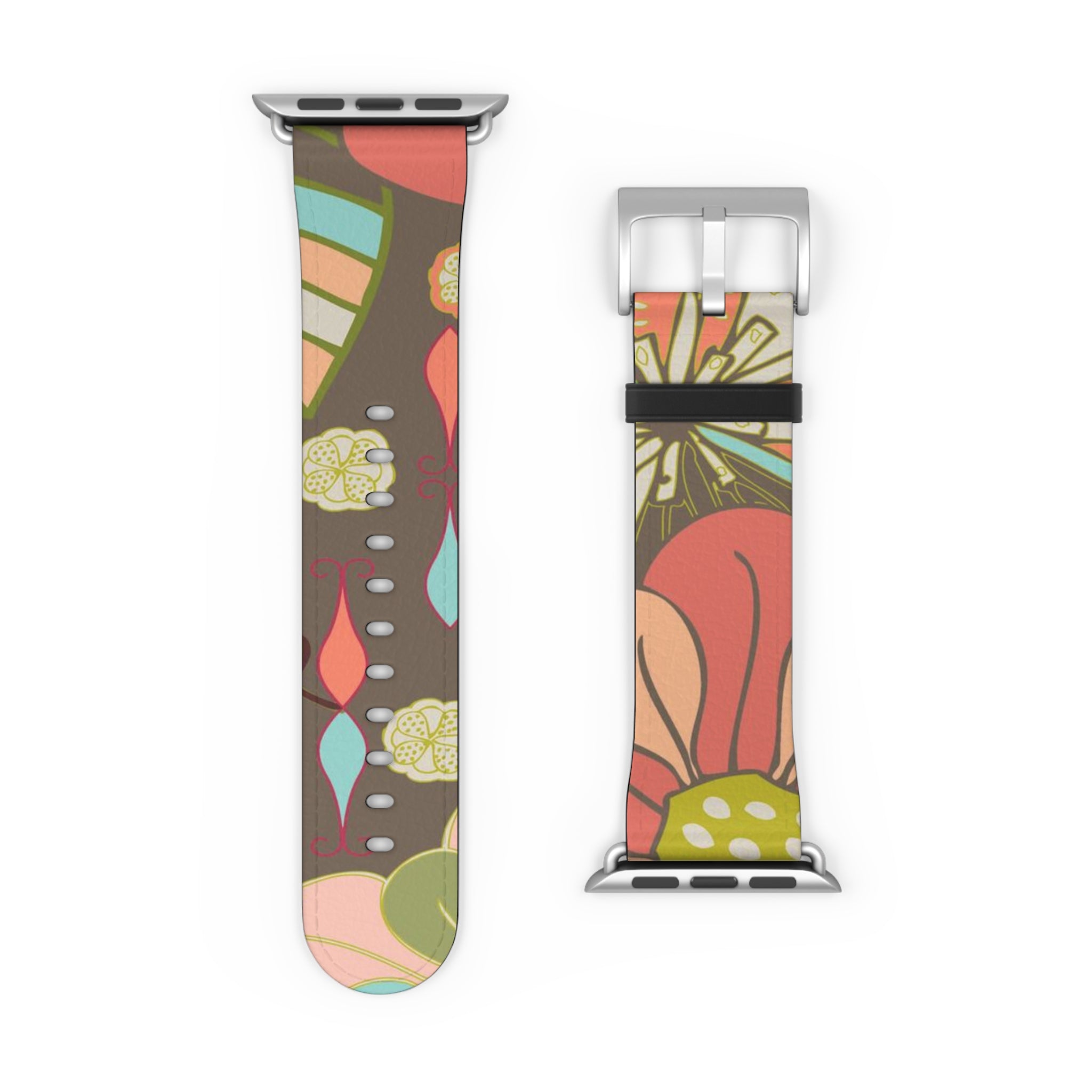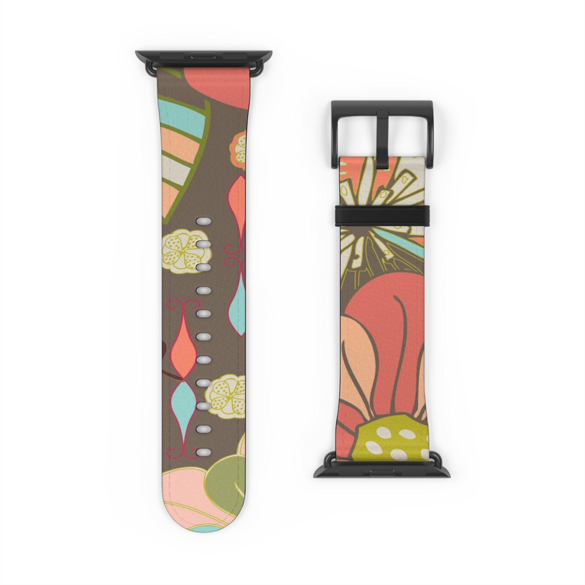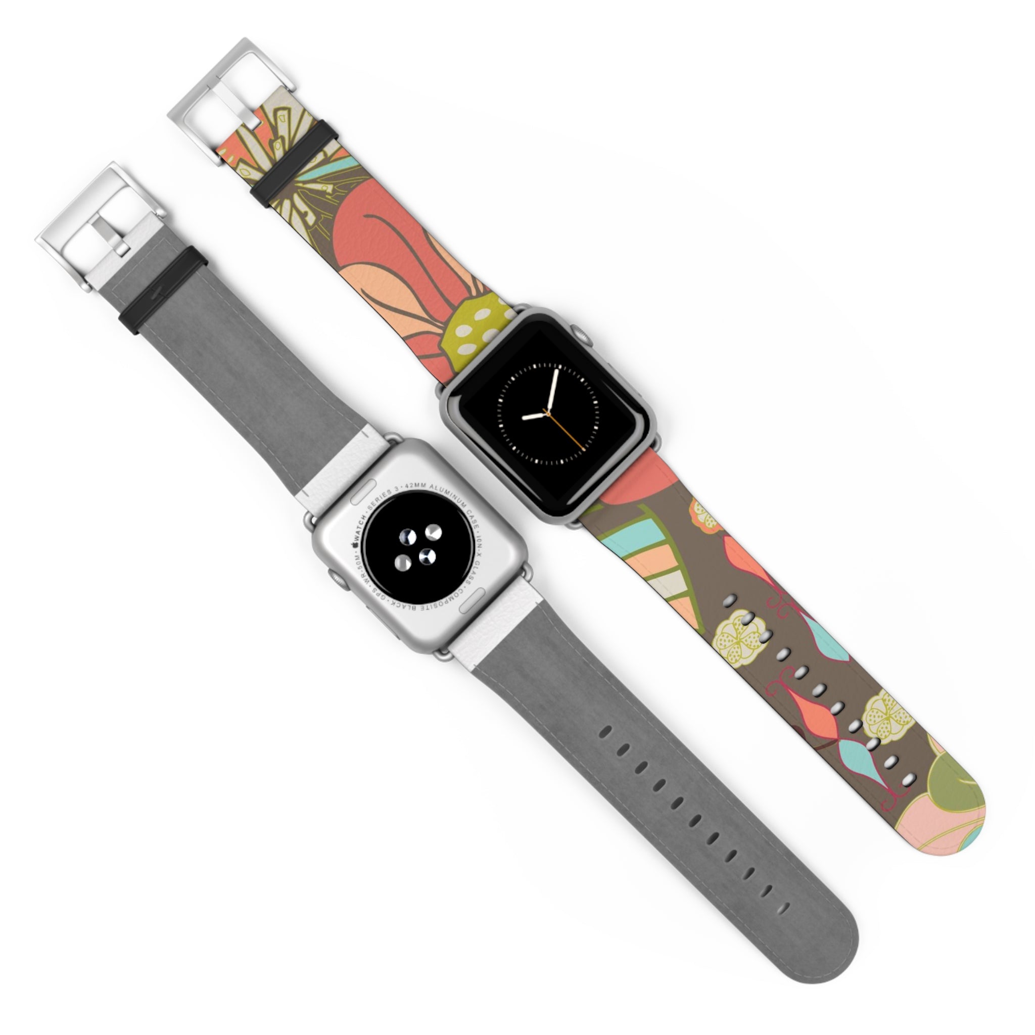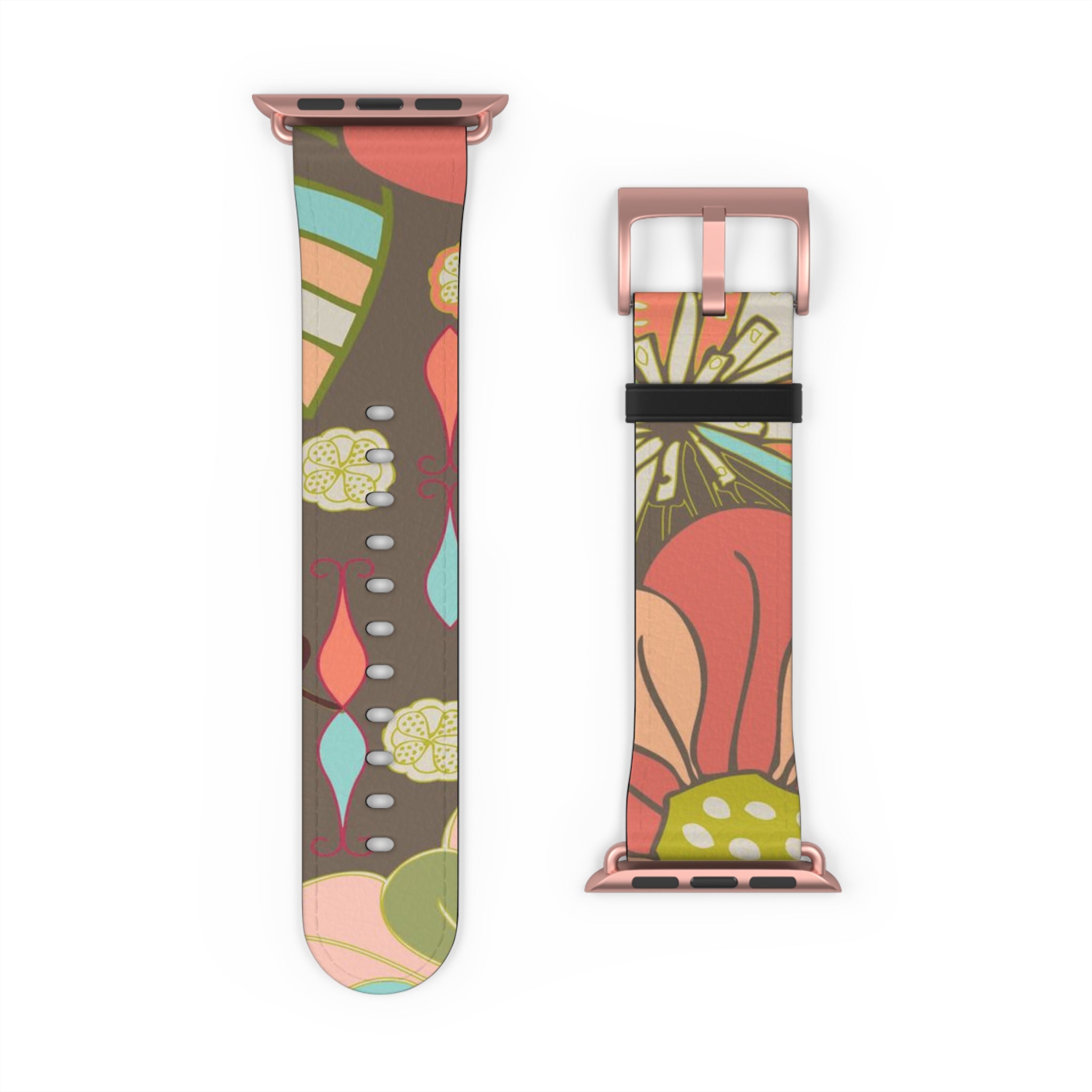 Apple Watch Band Series Ultra and SE Two Sizes Available 38mm-41mm or 42mm-45mm For Women Vegan Faux Leather Floral Brown Boho Design