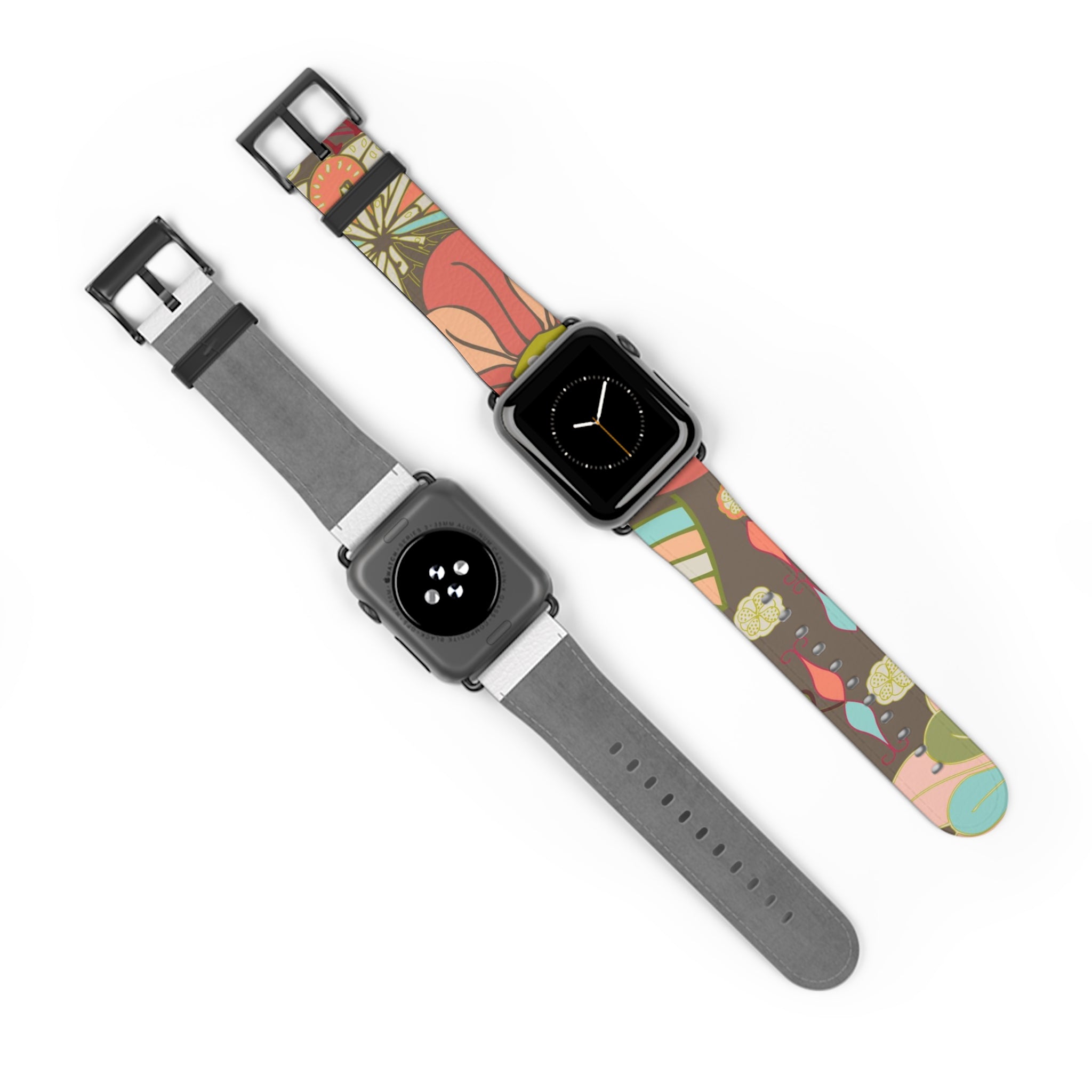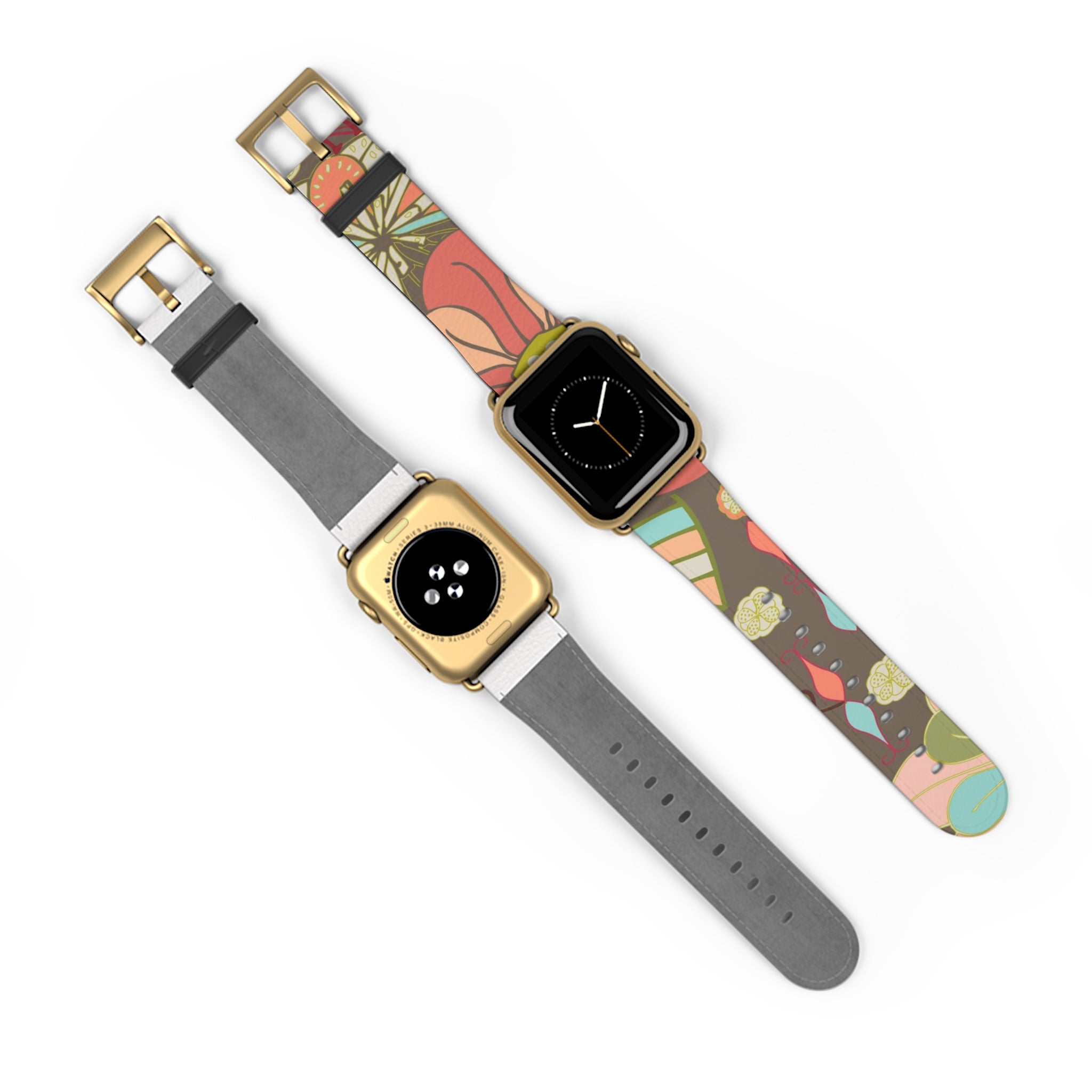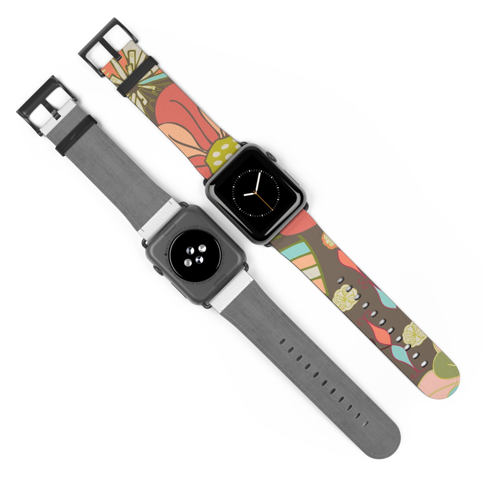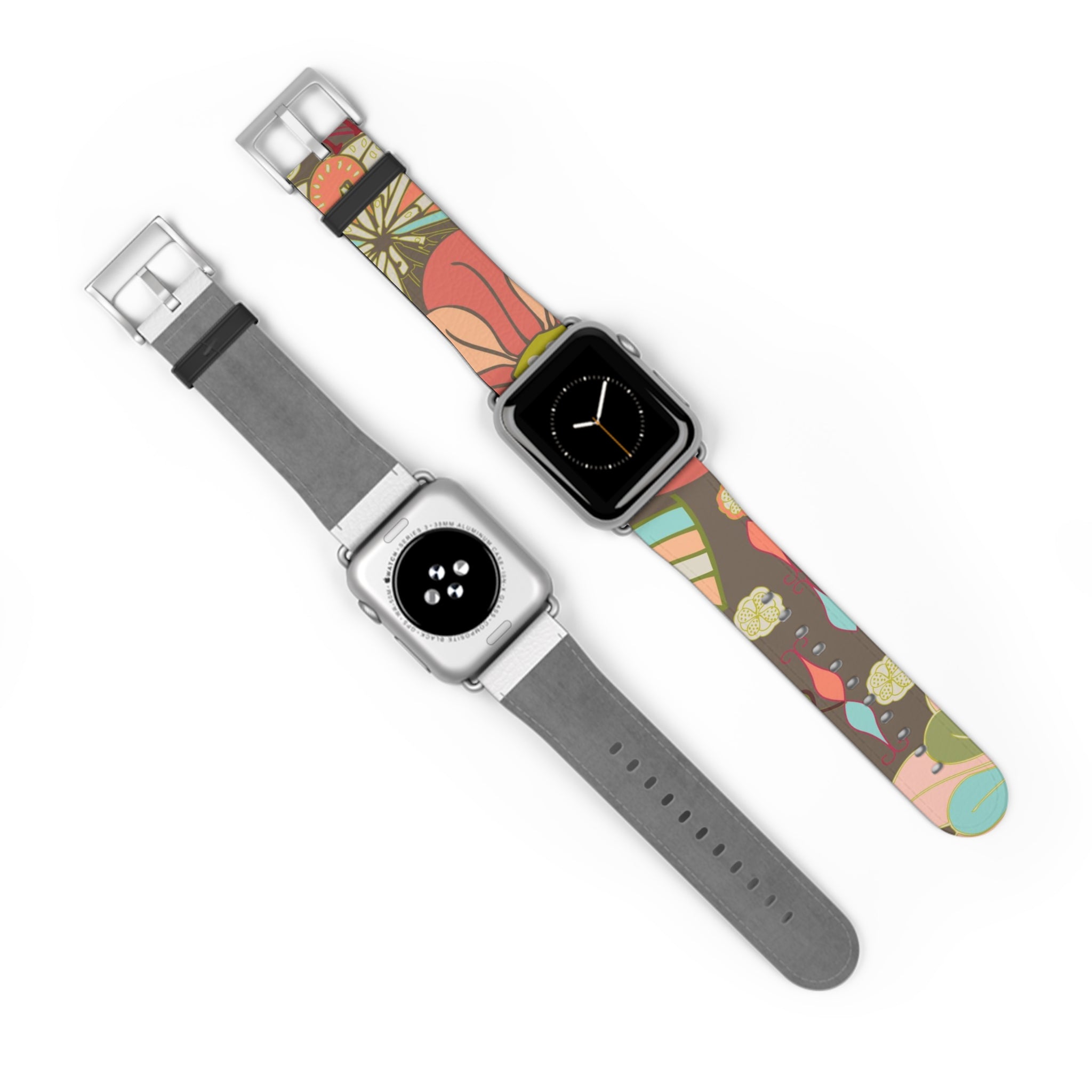 Apple Watch Band Series Ultra and SE Two Sizes Available 38mm-41mm or 42mm-45mm For Women Vegan Faux Leather Floral Brown Boho Design