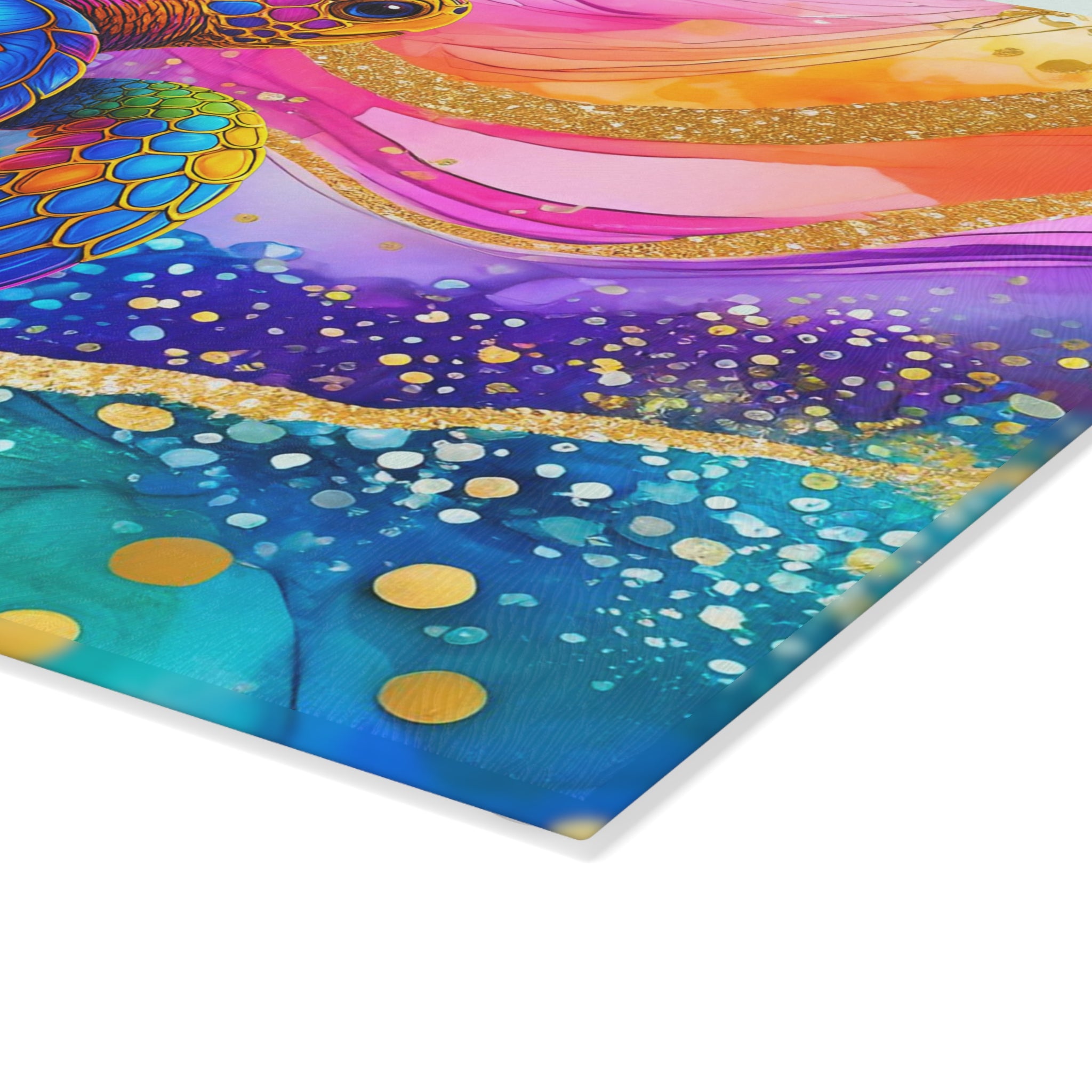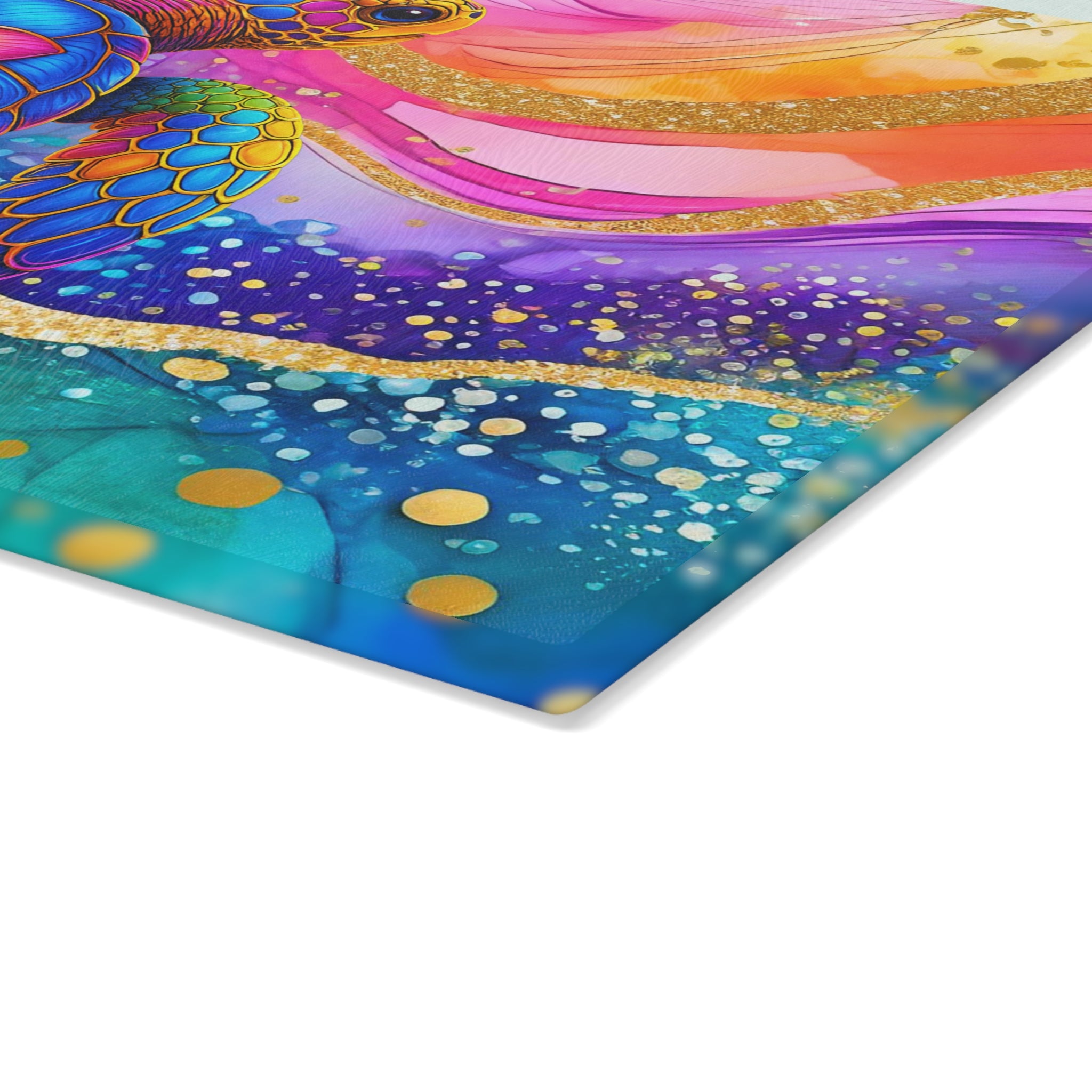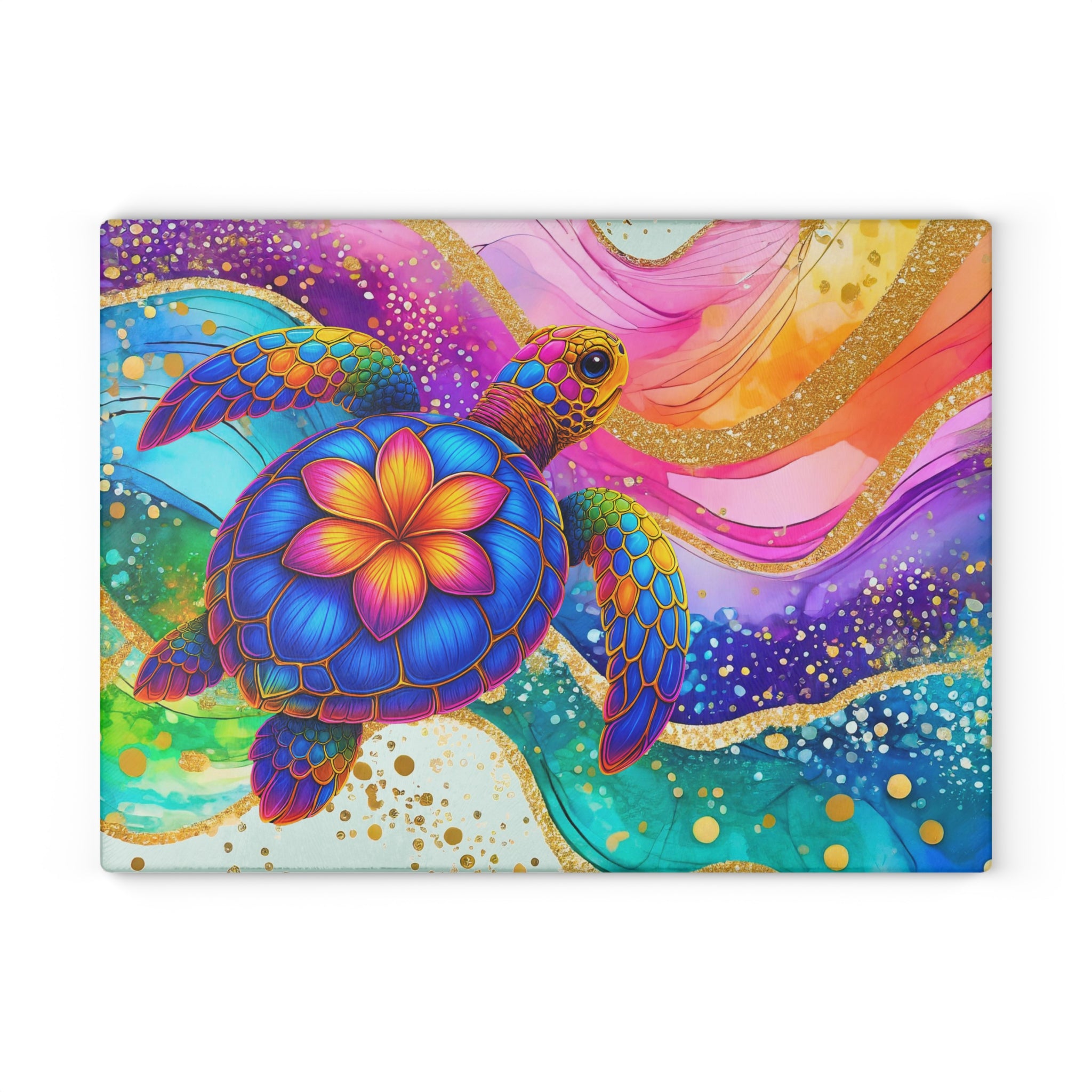 Bright, jewel-toned sea life meets kitchen utility in this tempered glass cutting board. A hand-painted-style sea turtle swims across swirling waves of magenta, teal, and gold — colors so vivid they feel like sunlight on water. The textured tempered glass surface stays sanitary and resists stains, while the special printing process locks the artwork beneath a durable finish that won’t scrape away during food prep. Four rubber feet hold the board steady on counters, and the slim profile fits neatly in cabinets or on display when not in use. This board isn’t just a tool — it’s a splash of color that turns chopping and serving into a small, joyful moment. Product features - Tempered, textured glass surface for sanitary food prep - Durable, scratch-resistant printed design - Four rubber feet for slip-resistant stability - Available in two sizes: 8"×11" and 11"×15" - Vibrant, fade-resistant color reproduction (hand wash recommended) Care instructions - Use regular dish soap for cleaning and wipe down with a damp cloth.