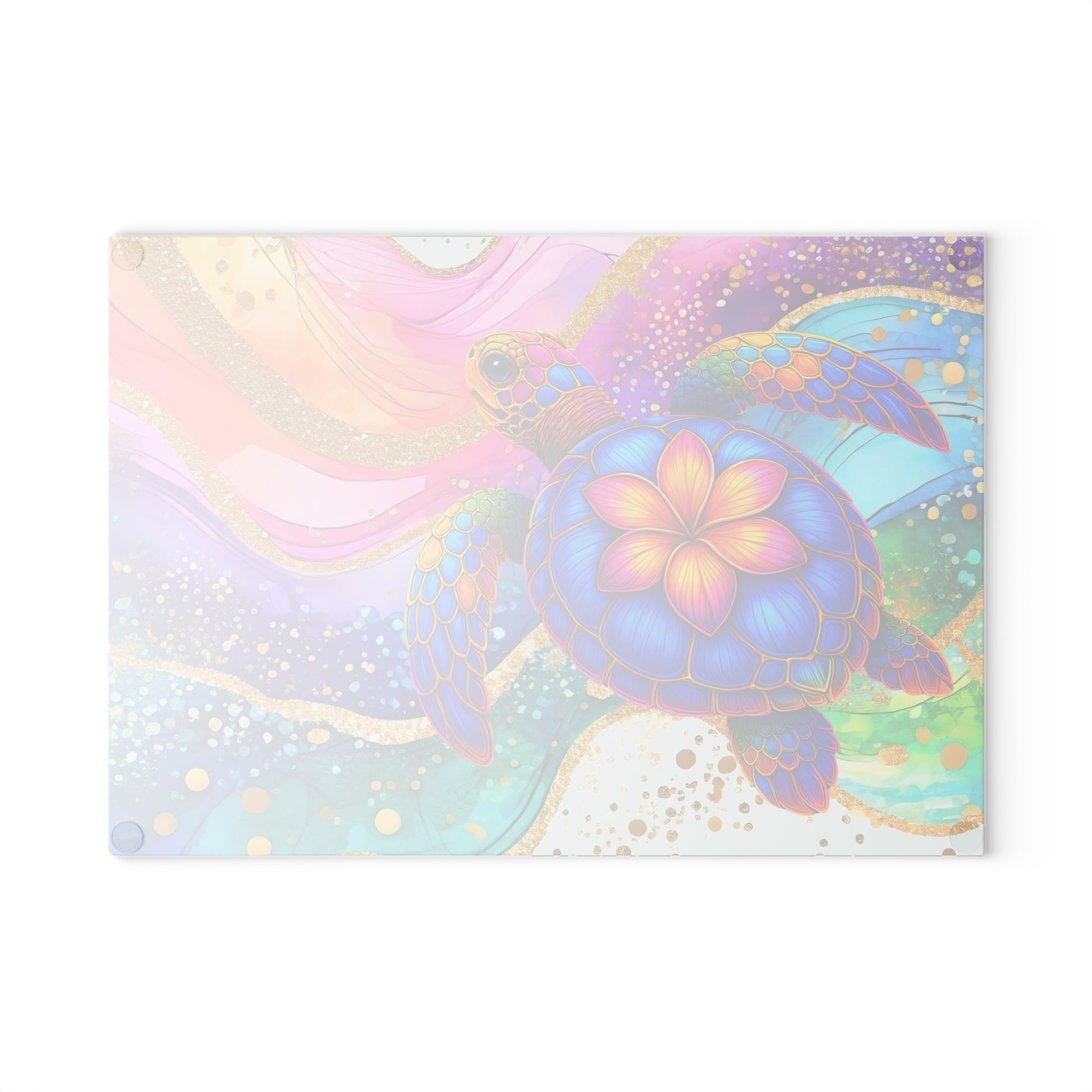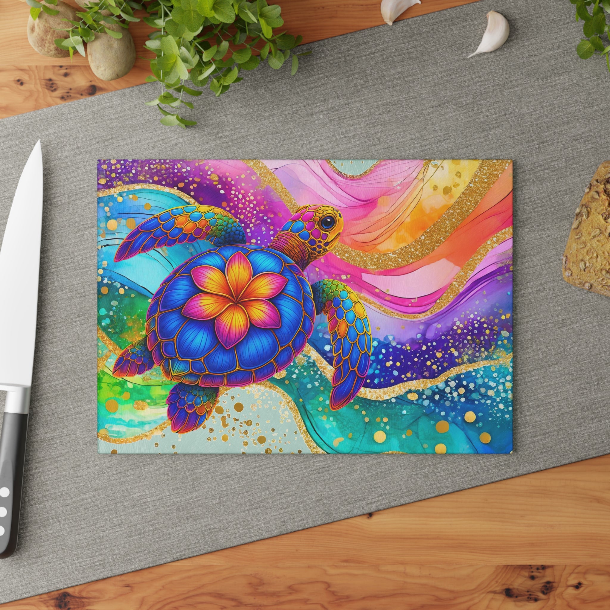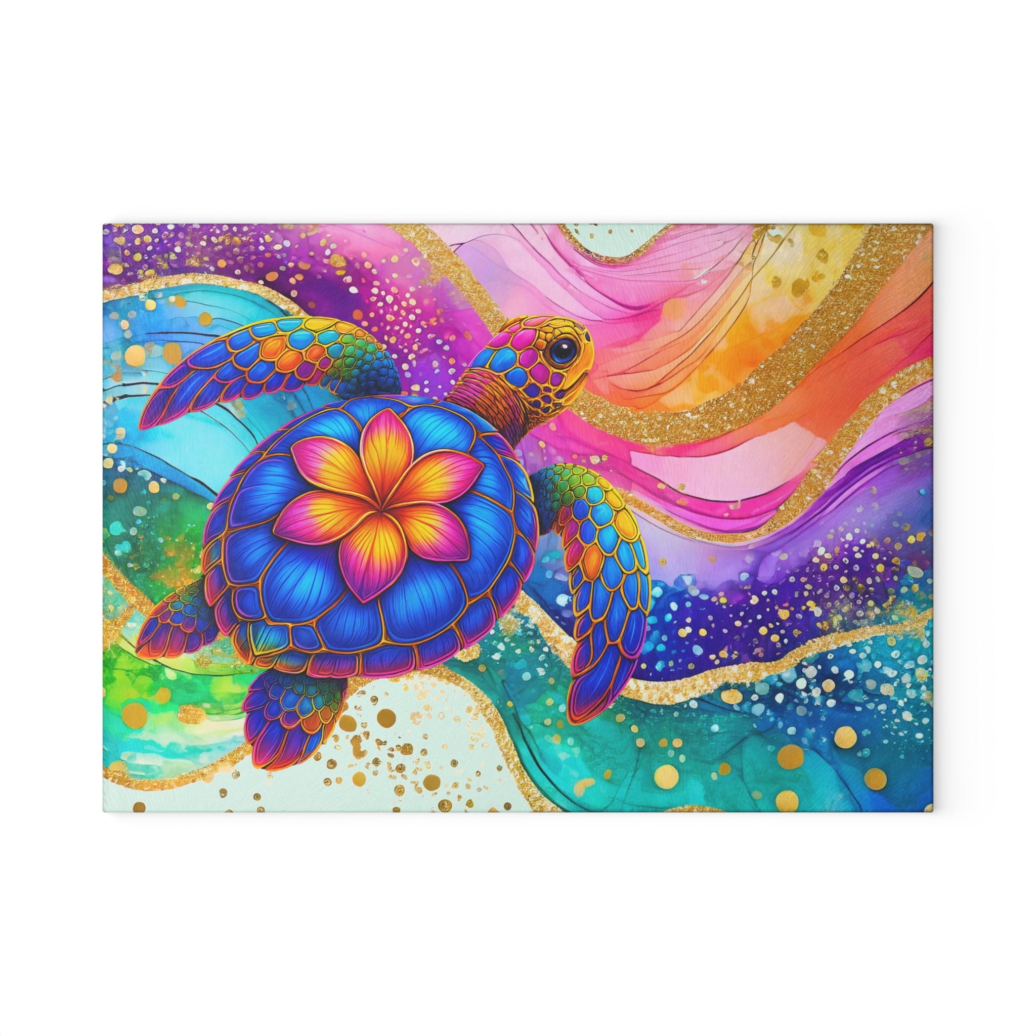 Bright, jewel-toned sea life meets kitchen utility in this tempered glass cutting board. A hand-painted-style sea turtle swims across swirling waves of magenta, teal, and gold — colors so vivid they feel like sunlight on water. The textured tempered glass surface stays sanitary and resists stains, while the special printing process locks the artwork beneath a durable finish that won’t scrape away during food prep. Four rubber feet hold the board steady on counters, and the slim profile fits neatly in cabinets or on display when not in use. This board isn’t just a tool — it’s a splash of color that turns chopping and serving into a small, joyful moment. Product features - Tempered, textured glass surface for sanitary food prep - Durable, scratch-resistant printed design - Four rubber feet for slip-resistant stability - Available in two sizes: 8"×11" and 11"×15" - Vibrant, fade-resistant color reproduction (hand wash recommended) Care instructions - Use regular dish soap for cleaning and wipe down with a damp cloth.