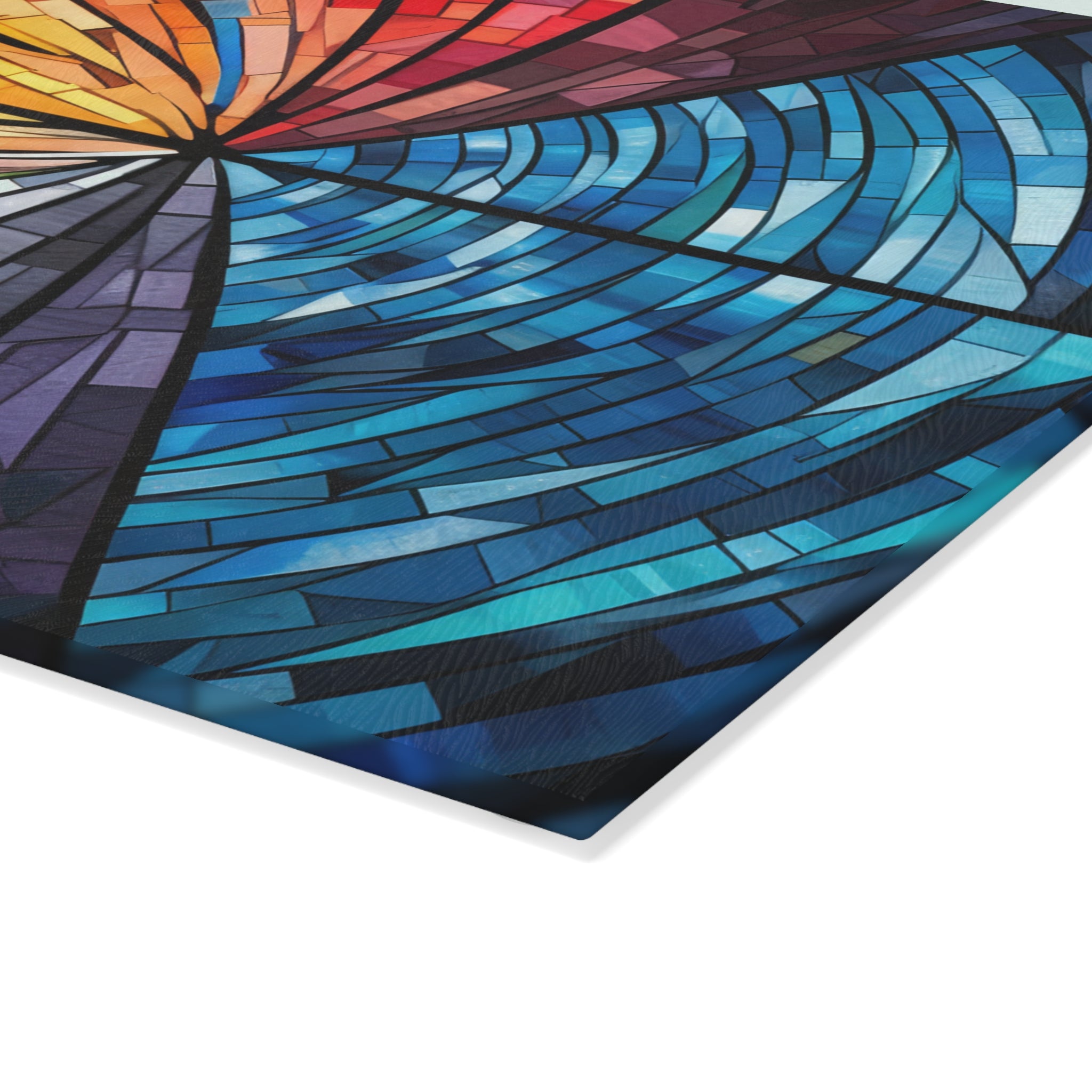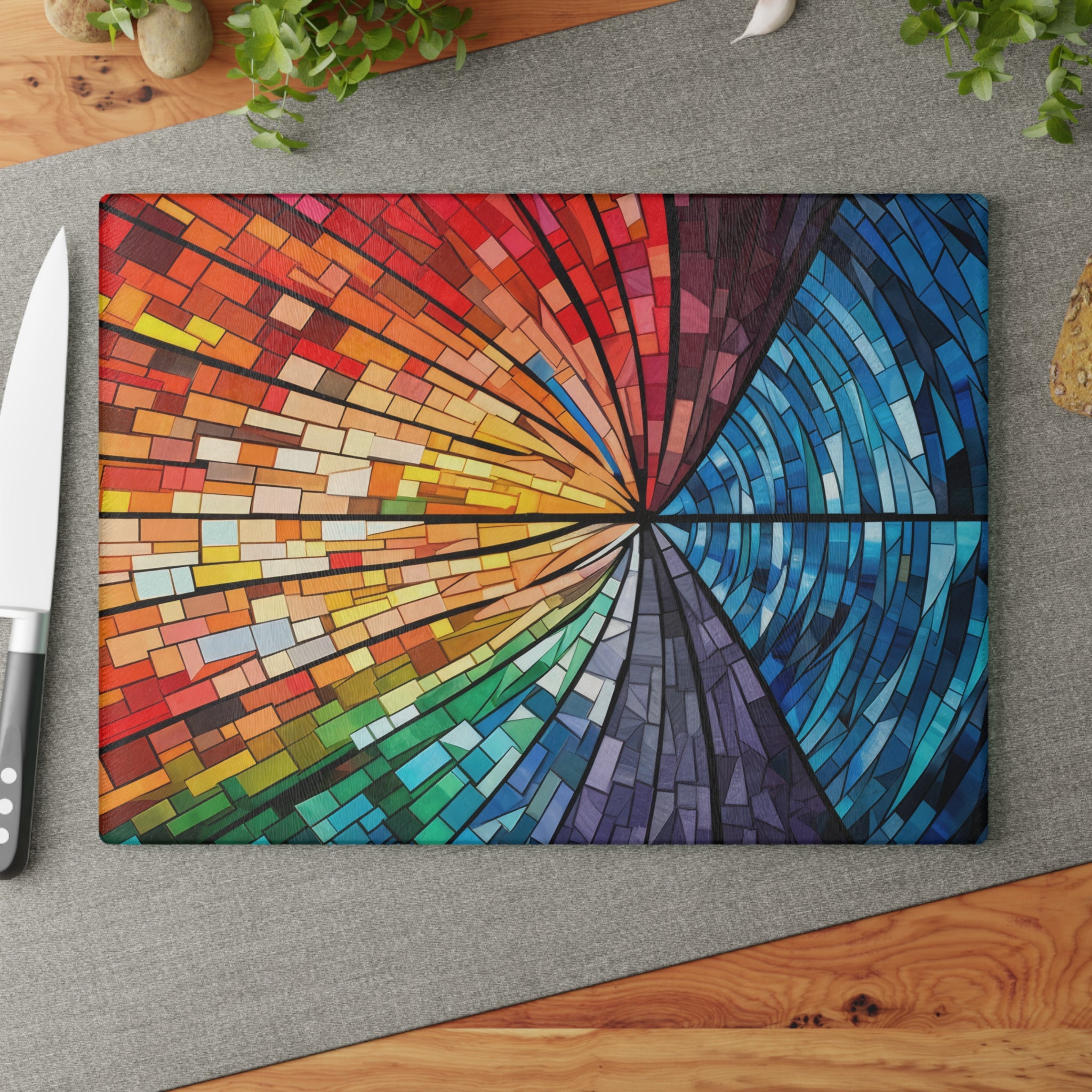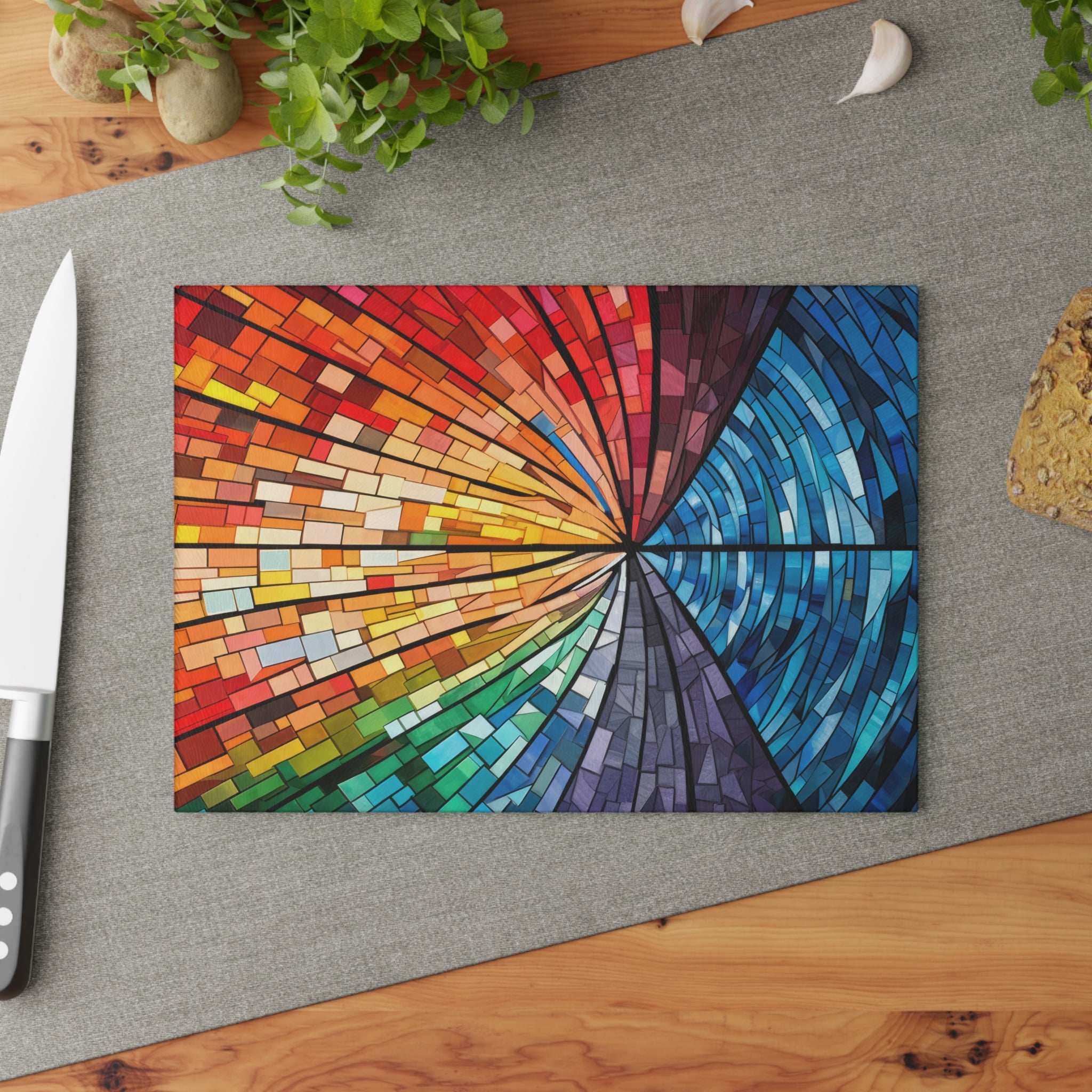 For anyone who loves to cook and bake, this glass cutting board is the perfect accessory. Custom made to look like stained glass, it's a beautiful addition to any kitchen. But it's not just another pretty cutting board - the tempered glass is strong and durable, making it perfect for all your chopping, slicing, and dicing needs. Plus, the textured surface provides a non-slip grip, making it even more user-friendly. Available in two sizes to fit your kitchen needs.